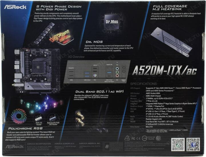 Материнская плата ASROCK A520M-ITX/AC, AM4, A520, 2*DDR4, HDMI+DP, 4xSATA3 6.0 RAID, M.2 Socket, 3xUSB 3.2, Type-C, 2xUSB 2.0, mITX; 90-MXBDG0-A0UAYZ