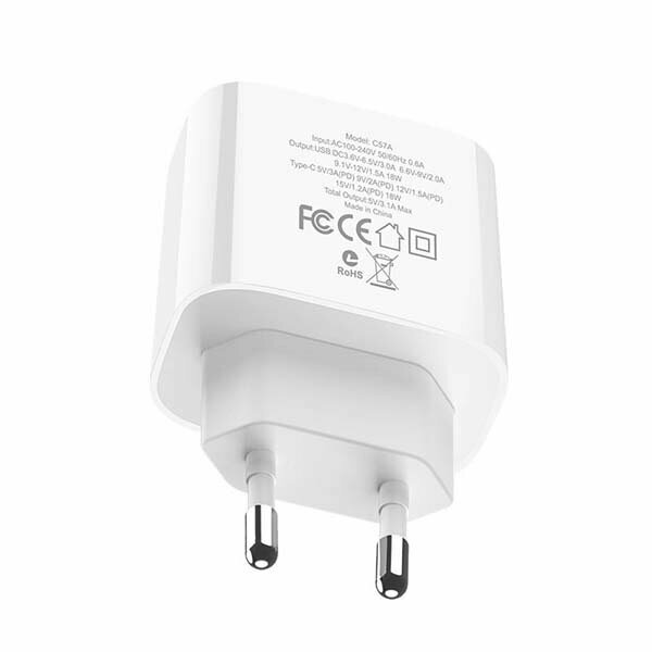 Сетевое зарядное устройство HOCO C57A Speed charger 1xUSB + 1xUSB-C, 3A, 18W, белый