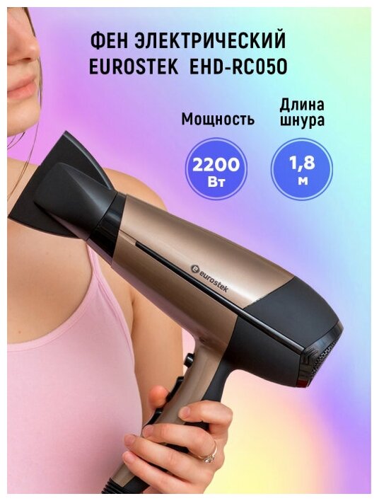 Фен электрический Eurostek EHD-RC05O, 2200 Вт, 2 режима мощности, 3 режима температуры, шампань интересное: