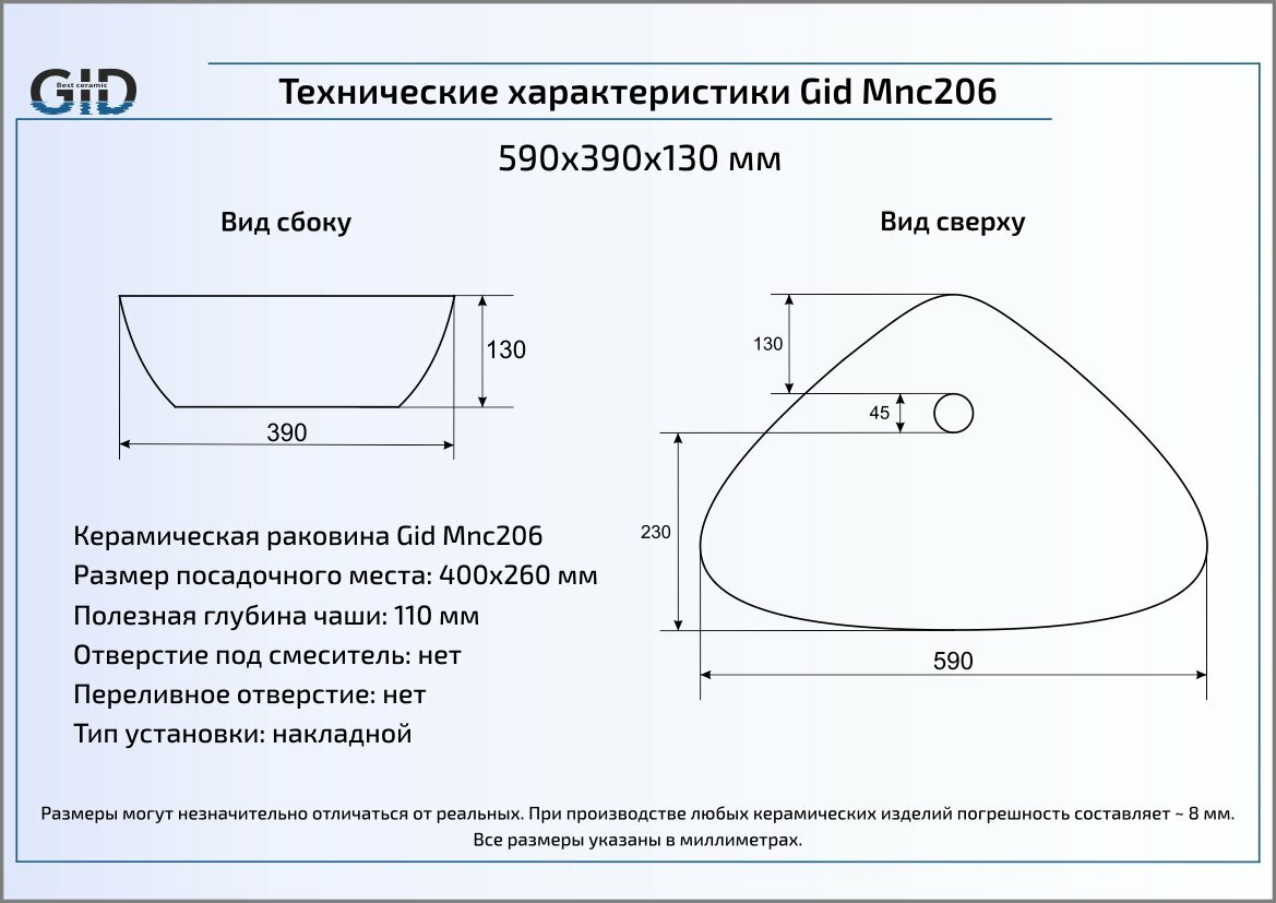 Накладная раковина для ванной Gid Mnc206 с донным клапаном