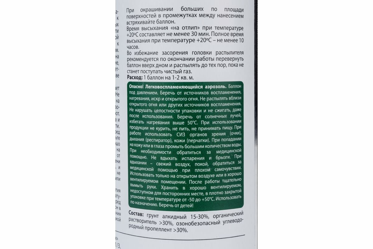 | Дополнительная информация | расход: 1 баллон на 1,5-2,5 кв. м (в зависимости от цвета грунта и количества слоев) |