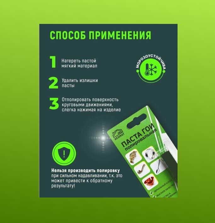 | Способ применения | 1. Нанести пасту ГОИ на мягкий металл (хлопчатобумажную, шерстяную или полушерстяную ткань) путем натирания. 2. Убрать крупные излишки пасты ГОИ. 3. Отполировать изделие круговыми движениями со средней степенью нажима, иначе можно сделать царапины. 4. Не наносить пасту на саму полируемую поверхность, это может привести к появлению глубоких царапин. |
