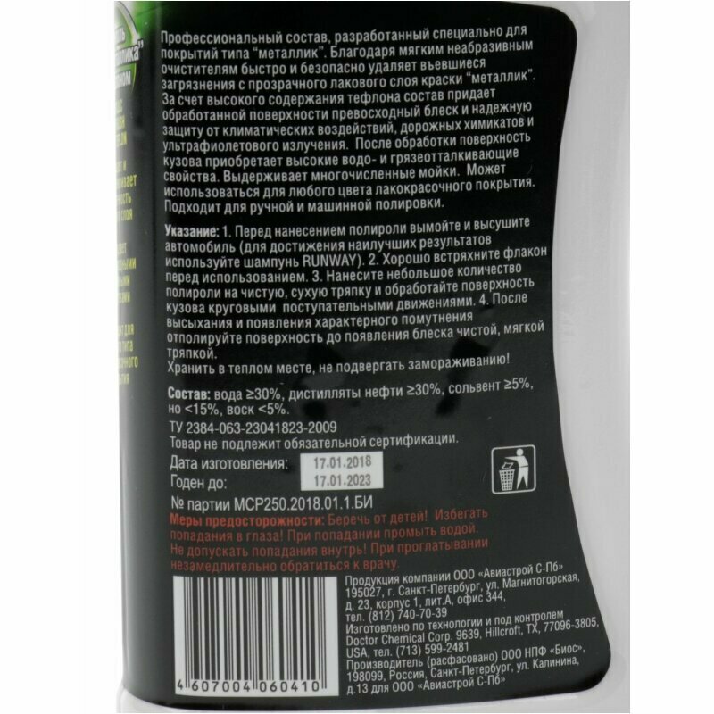 Полироль кузова Runway Metallic Car Polish, защитный, с тефлоном, для покрытий типа «металлик», бутылка 250мл, арт. RW2541