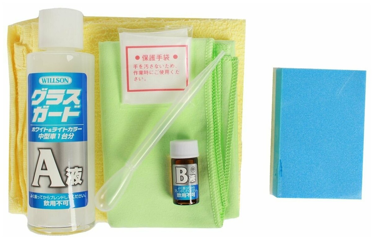 | Дополнительная информация | обьем - 110 мл (состав A) + 4,5 мл (состав B); структура - состав А - алкосилан, алкоксисилокан, изопарафин, нонан, диоксид кремния; состав B - органометаллический состав, 1-бутанол; расход средства - примерно 50 мл на 1 легковой автомобиль; сохранение защитных свойств - защита кузова - до 1 года, блеск и гидрофобность - до 6 месяцев; срок годности - 5 лет (дата изготовления указана на упаковке); сертификат - Willson Co. Ltd. 6-13, Saginomiya-1-Chome, Nakano-ku, Tokyo 165-0032 |
