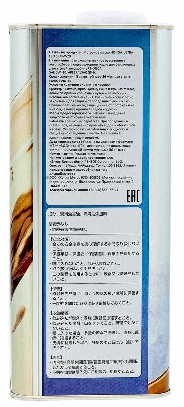 Моторное масло HONDA ULTRA LEO API SP ILSAC GF 6 0w-20, 4л