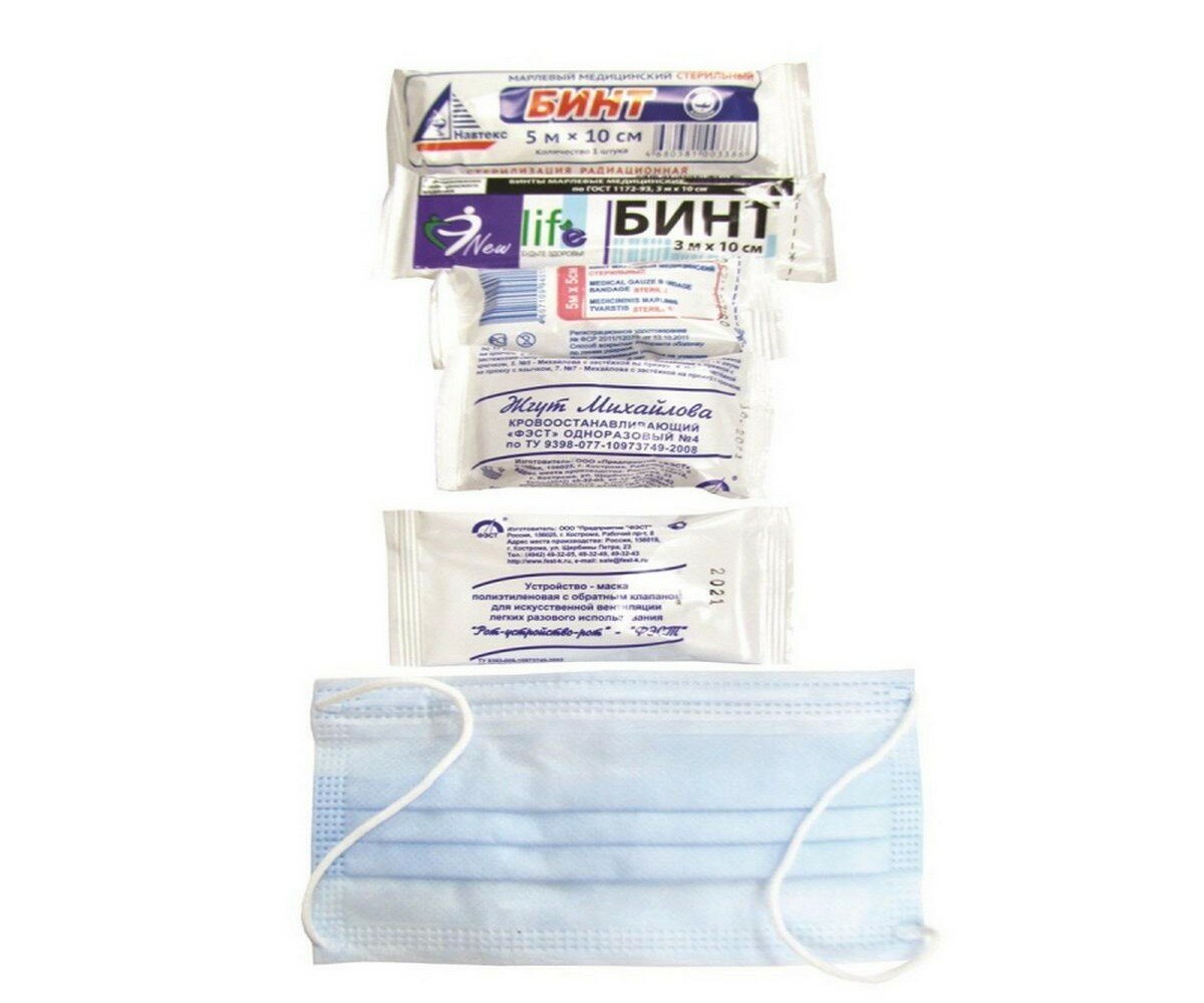 | Состав | бинт нестерильный 3м х 10см - 1 шт.; бинт стерильный 3м х 5см - 1 шт.; бинт стерильный 3м х 10 см - 1 шт.; жгут кровоостанавливающий для остановки артериального кровотечения - 1 шт.; устройство для проведения искусственного дыхания "Рот-Устройство-Рот" - 1 шт. |