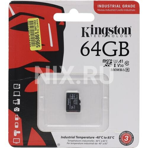 Промышленная карта памяти microSDXC Kingston, 64 Гб Class 10, темп. режим от -40℃ до +85℃, с адаптером