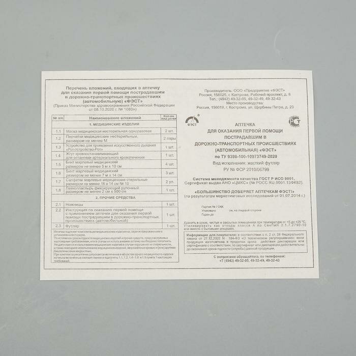Аптечка автомобильная ФЭСТ футляр из полистирола, новый состав по приказу № 1080Н от 08.10.20