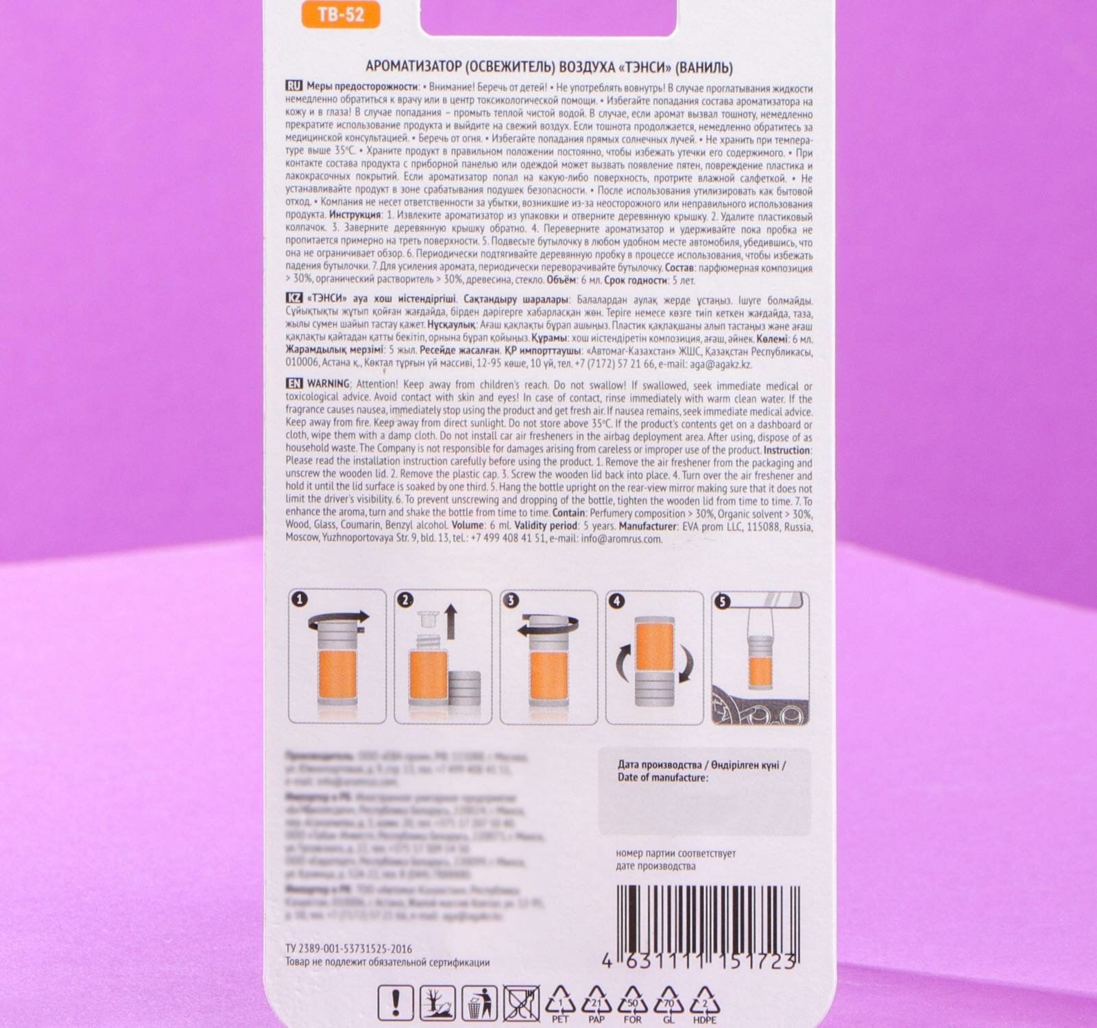 Ароматизатор ТероПром 6884732 Tensy в бутылочке 6 мл, Ваниль, блистер ТВ-52