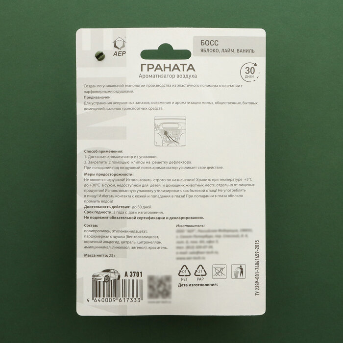 АЕР Ароматизатор в дефлектор "Граната" Boss А 3701