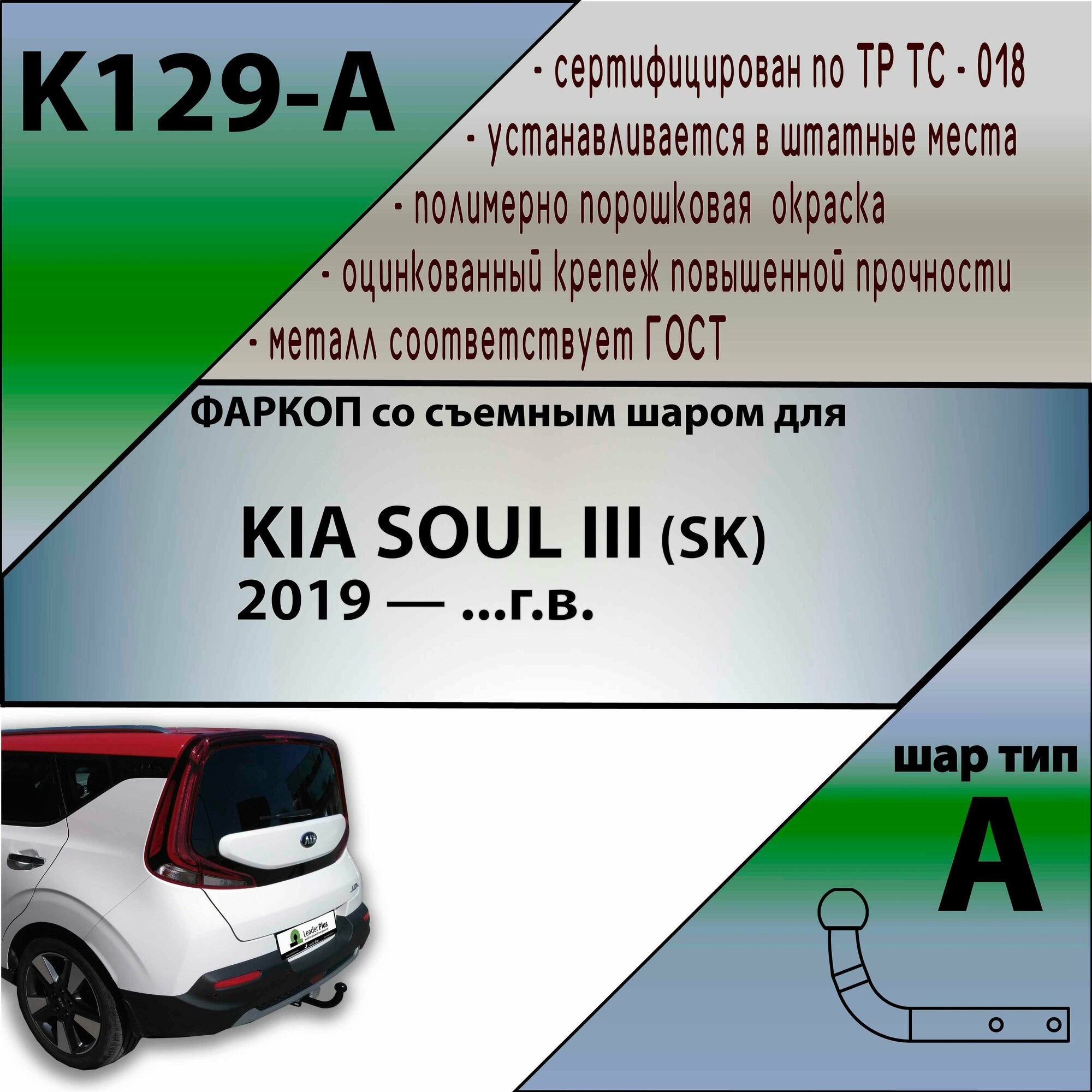 Фаркоп Leader-Plus (ТСУ K129-A) для Kia Soul III (с 2019 года) со съемным шаром + сертификат