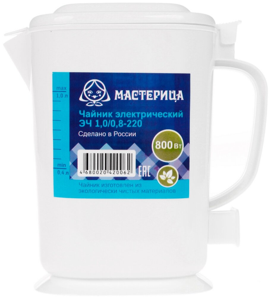 Чайник электрический Мастерица ЭЧ-10/08-220Б, пластиковый, белый, 1 л, 800 Вт