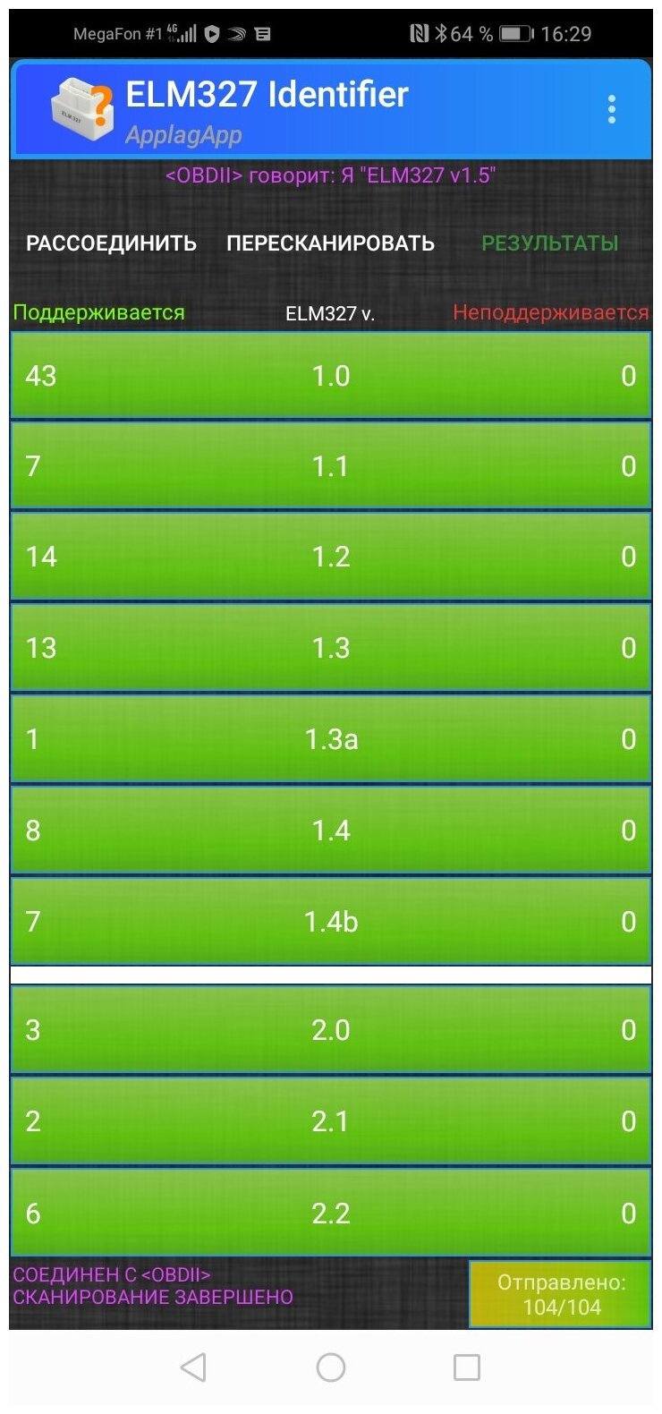 | Совместимость | Поддерживаемые протоколы ELM327: - ISO15765-4 (CAN): Audi, Opel, VW, Ford, Jaguar, Renault, Peugeot, Chrysler, Porsche, Volvo, Saab, Mazda, Mitsubishi - ISO14230-4 (KWP2000): Daewoo, Hyundai, KIA - ISO9141-2: Honda, Infinity, Lexus, Nissan, Toyota, Audi, BMW, Mercedes, Porsche - J1850 VPW: Buick, Cadillac, Chevrolet, Chrysler, Dodge, GM, Isuzu - J1850 PWM: Ford, Lincoln, Mazda |