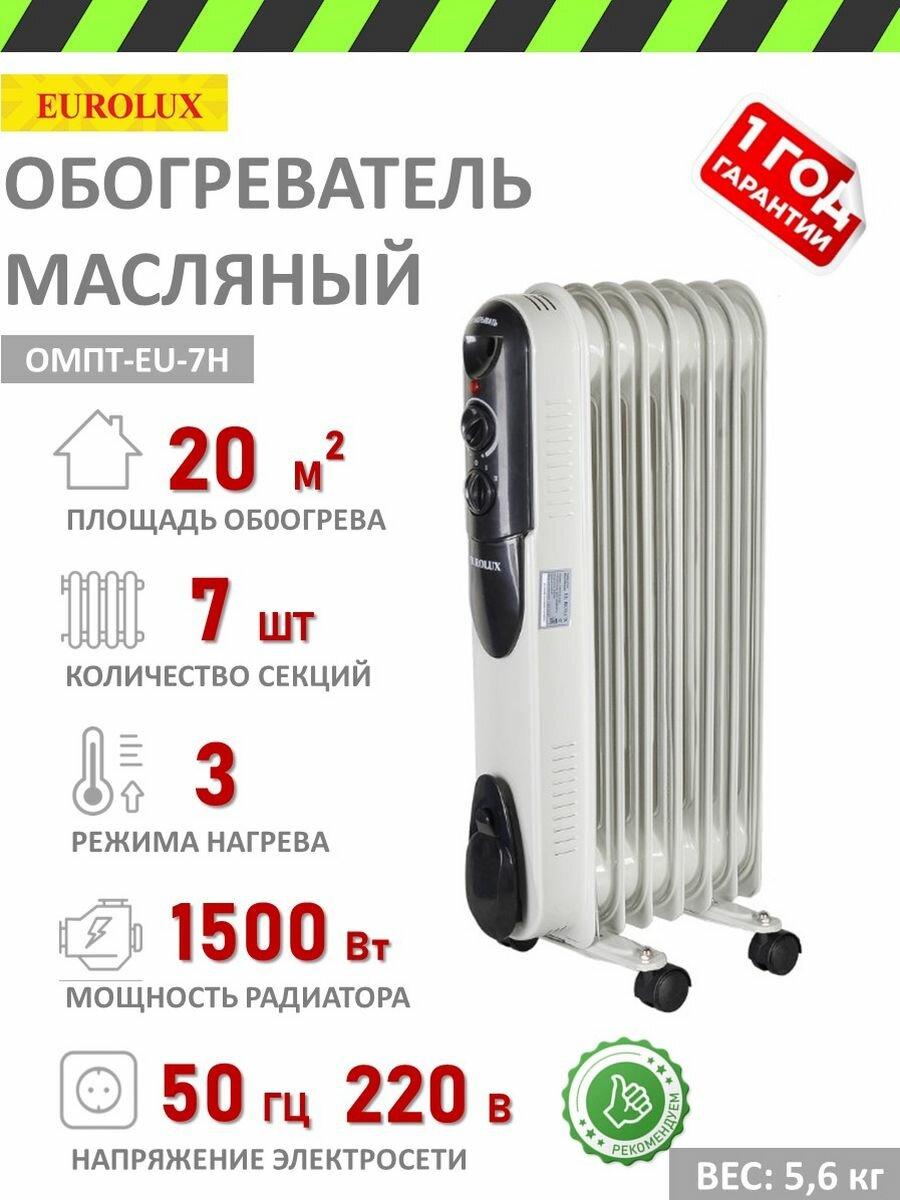 Масляный радиатор Eurolux ОМПТ-EU-7Н, 1500 Вт, 7 секций, 20 м², термостат, 5.6 кг
