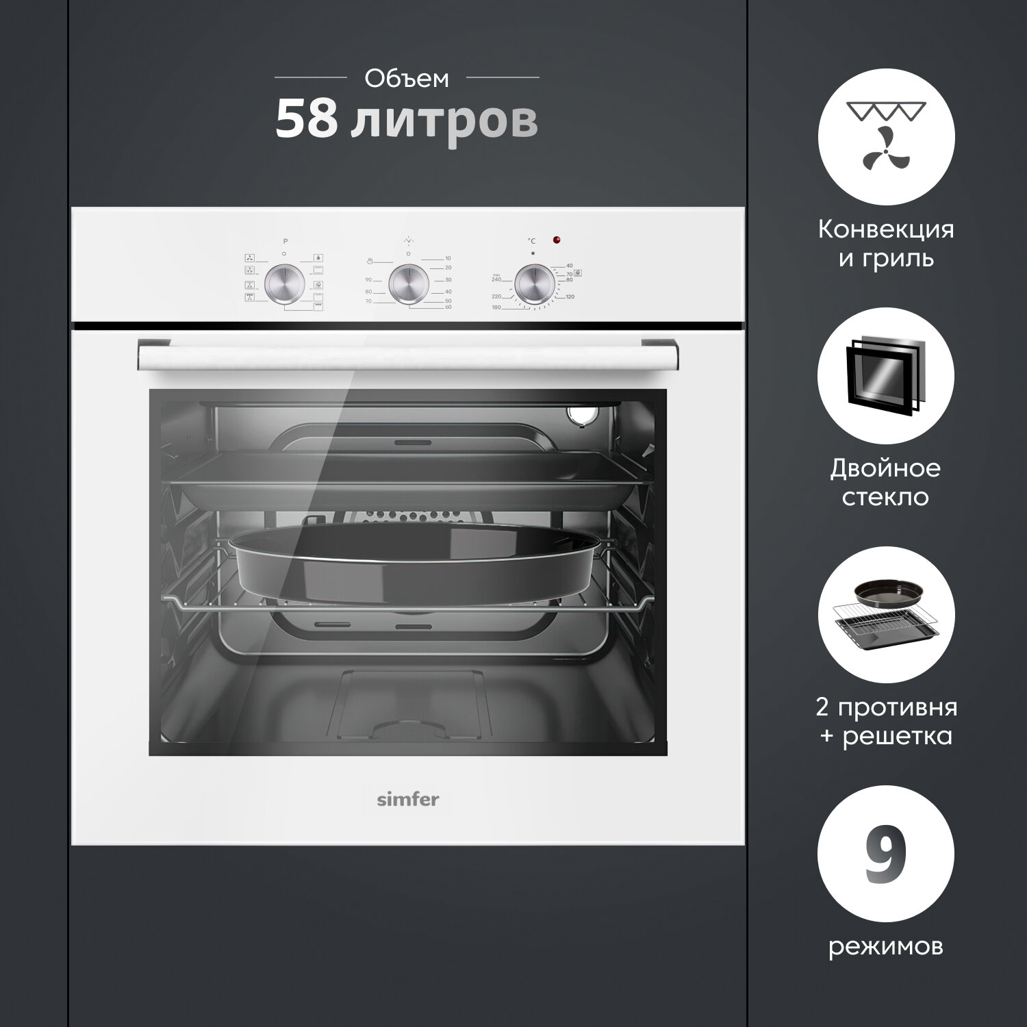 Электрический встраиваемый духовой шкаф Simfer / ширина 60см / 9 режимов работы / 3D конвекция, гриль, таймер / 58 литров / подсветка / 2 противня + хромированная решётка / 5 лет гарантии / черный