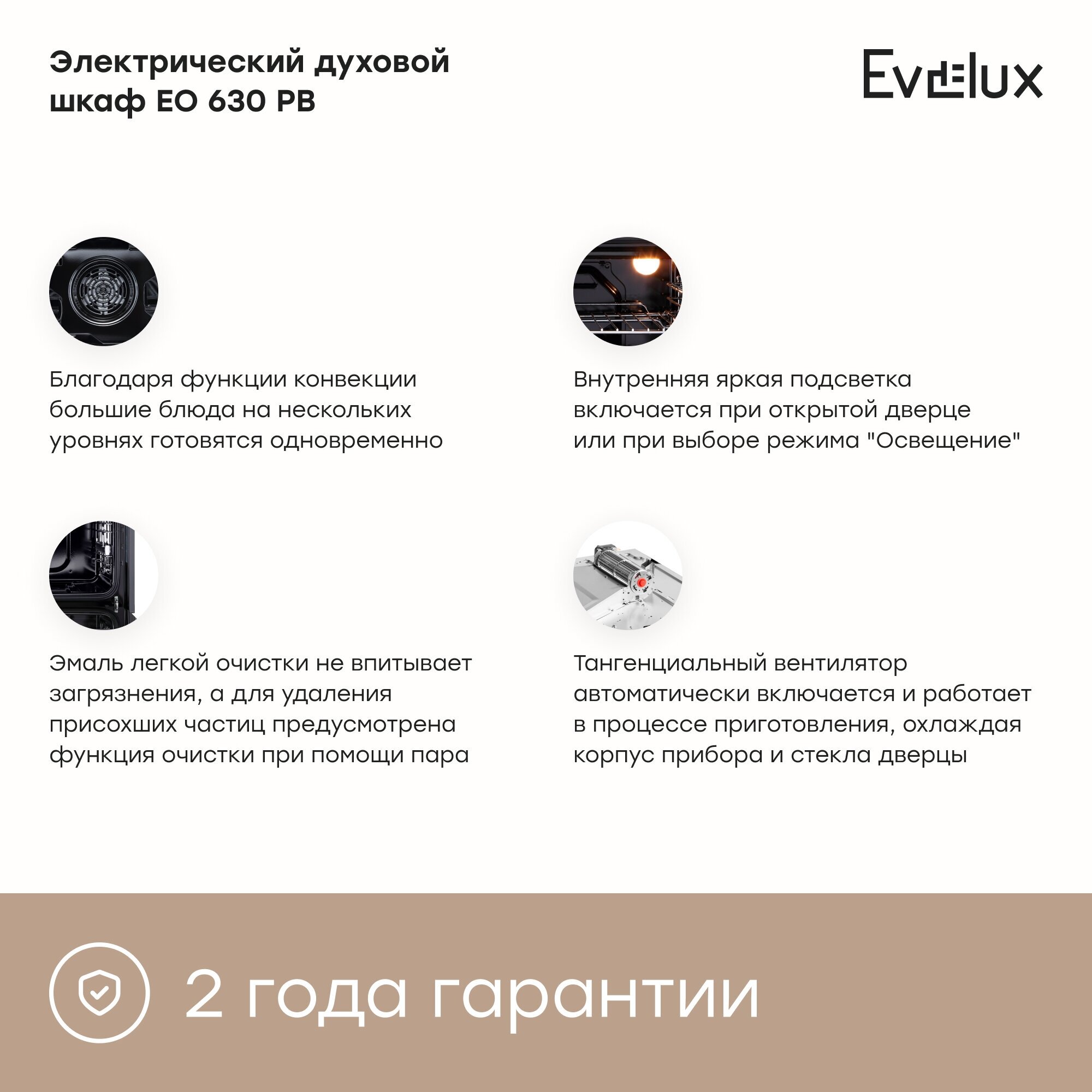Шкаф духовой электрический Evelux EO 630 PB, 8 режимов работы, верхний и нижний нагрев, конвекция, гриль, таймер, часы, объём 70 л, 2-ое стекло дверцы, подсветка, противень + решётка