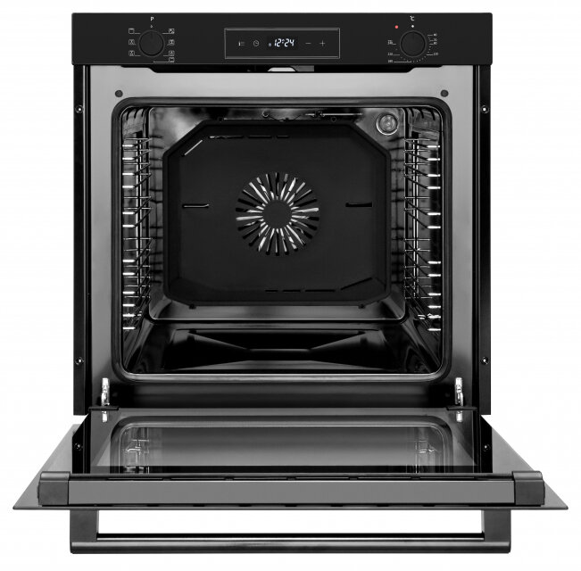 | Плюсы: | Смотрится шикарно, искали с чёрной ручкой)) Объём 80 литров, много режимов, особенно порадовали противни, один очееень глубокий. |