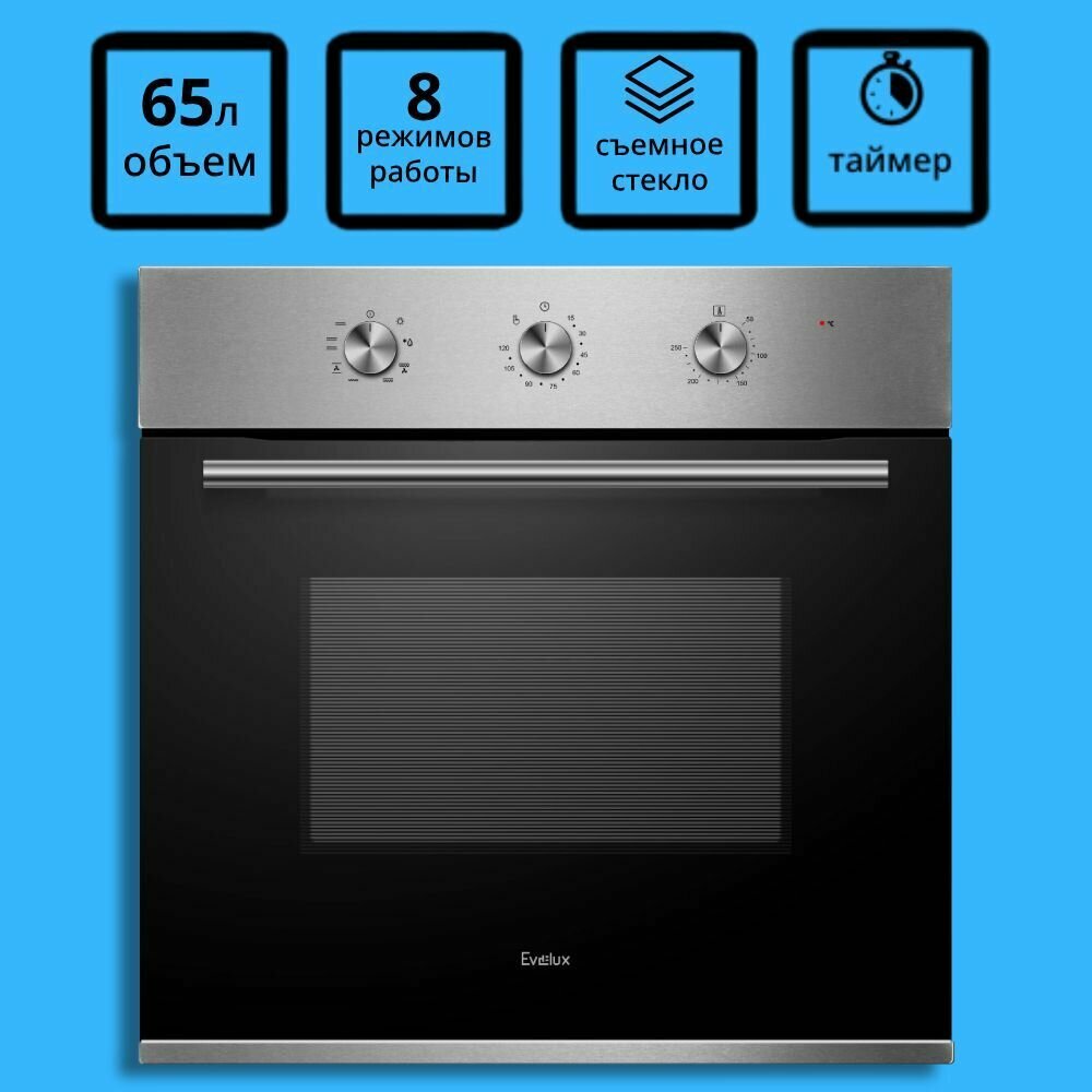 Электрический духовой шкаф Evelux EO 620 X, 8 режимов работы, верхний и нижний нагрев, конвекция, гриль, таймер, объём 65 литров, 2-ое стекло дверцы, подсветка, противень + хромированная решётка, 60 см