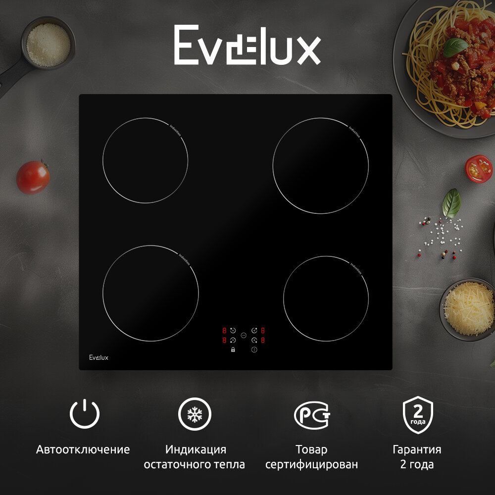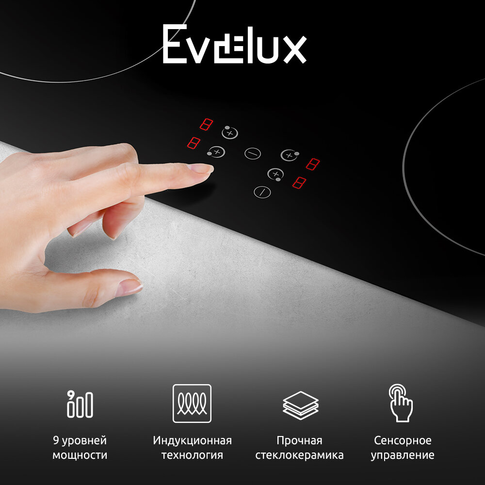 Индукционная варочная панель Evelux HEI 640 B, высокопрочная стеклокерамика, 9 уровней мощности, блокировка управления, индикатор остаточного тепла, распознавание наличия посуды