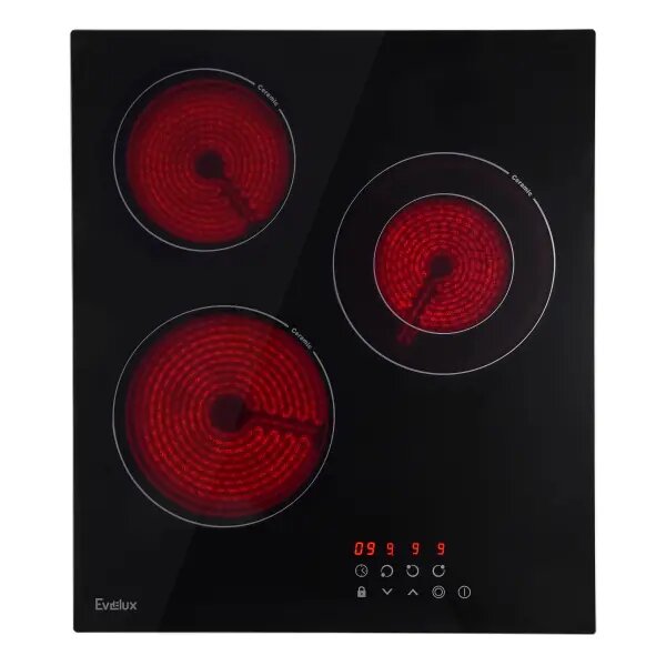 Варочная панель электрическая Evelux HEV 431 W, 3 конфорки с технологией Hi-Light, двухконтурная зона нагрева, ширина 45 см, таймерное отключение, блокировка панели, белое стекло Eurokera