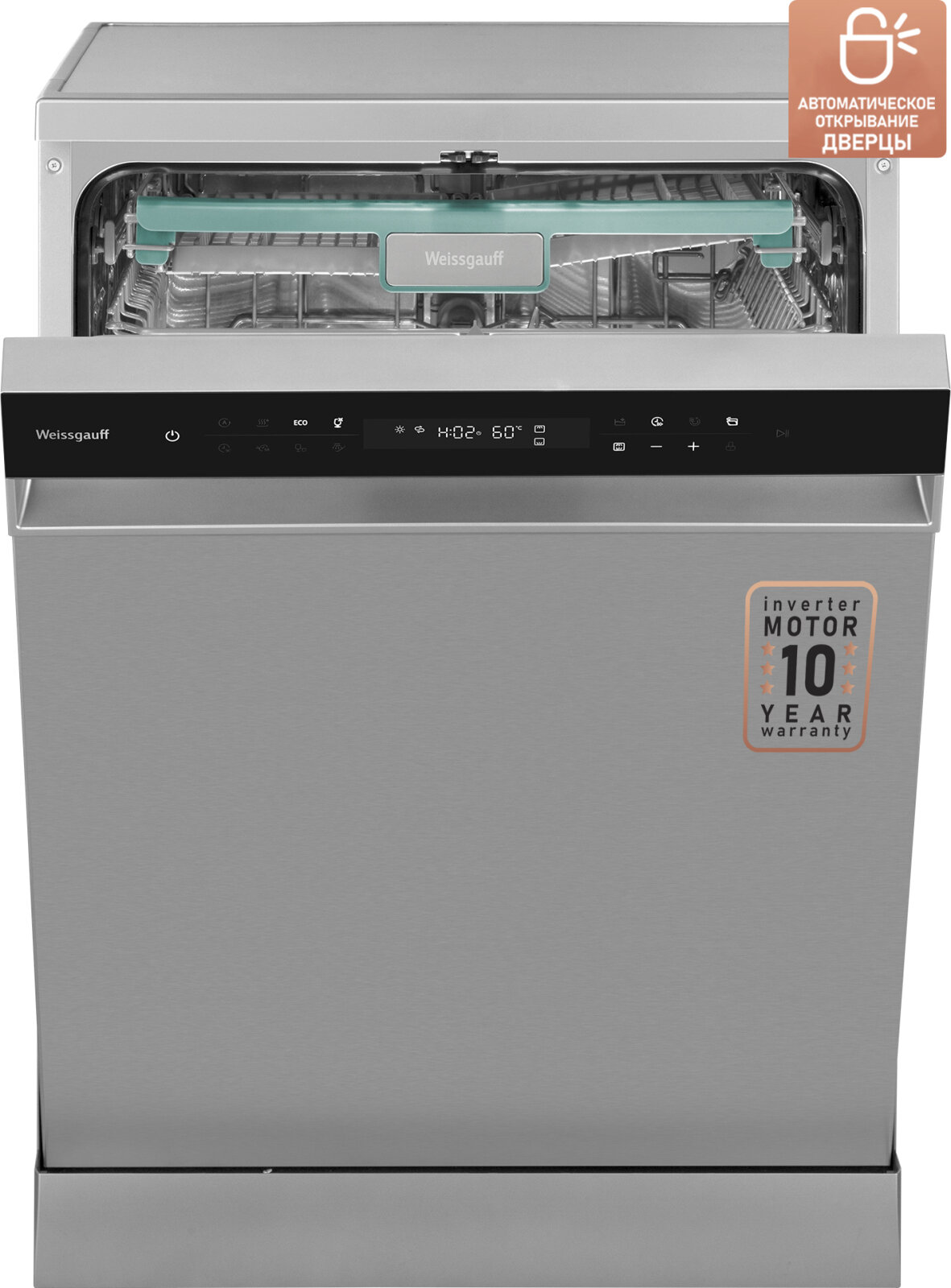 Посудомоечная машина с авто-открыванием и инвертором Weissgauff DW 6138 Inverter Touch Inox,3 года гарантии, 14 комплектов посуды, 9 программ, самоочистка, быстрая мойка, режим стерилизации, дополнительная сушка, таймер, блокировка от детей