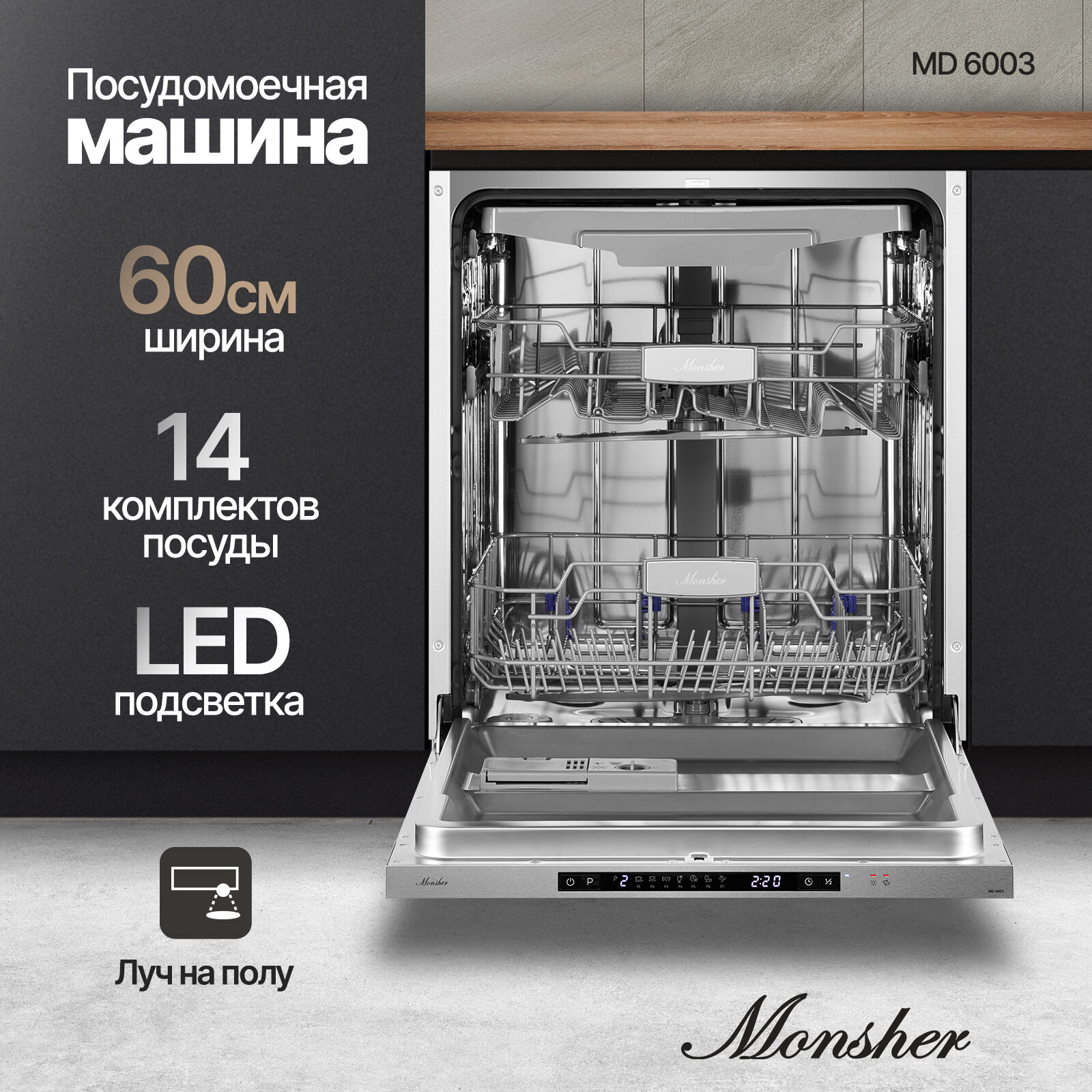 Встраиваемая посудомоечная машина Monsher MD 6003, с лучом на полу (Модификация 2024 года)