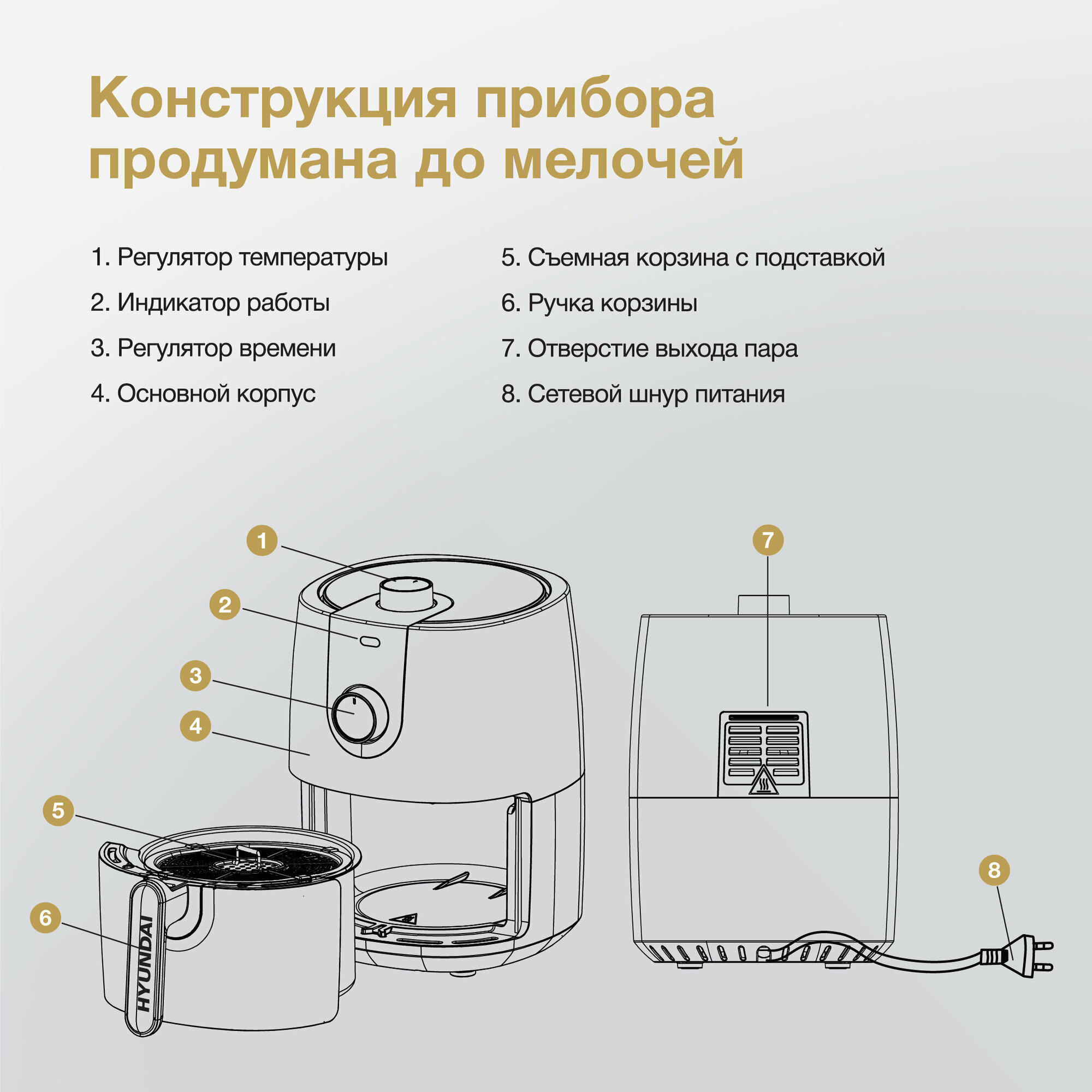 Аэрогриль Hyundai HYF-2057 1000Вт черный/золотистый интересное: