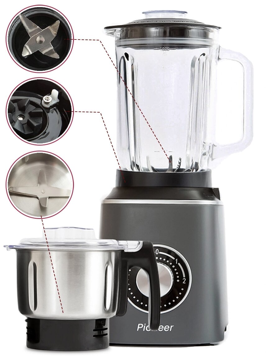 Кофемолка электрическая Pioneer 2 в 1 со стационарным блендером, 500 мл + стеклянный кувшин 1,5 литра, 6 лепестковый нож, 2 скорости, импульсный режим, 800 Вт