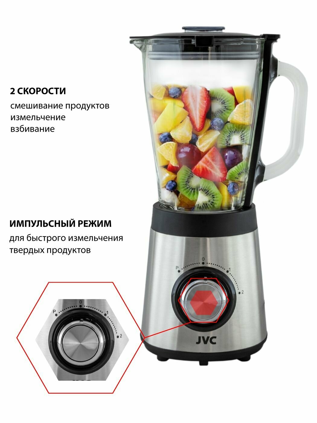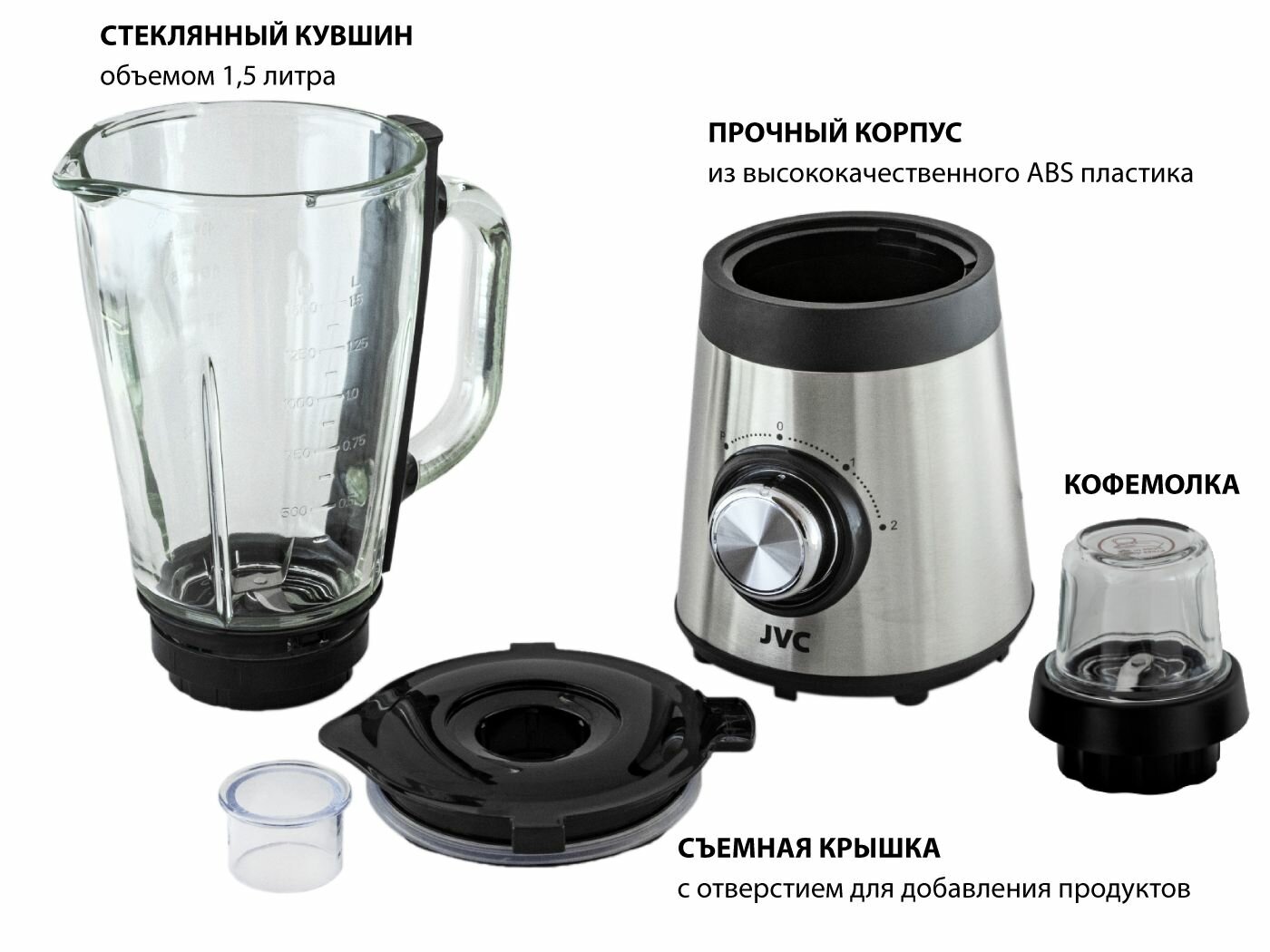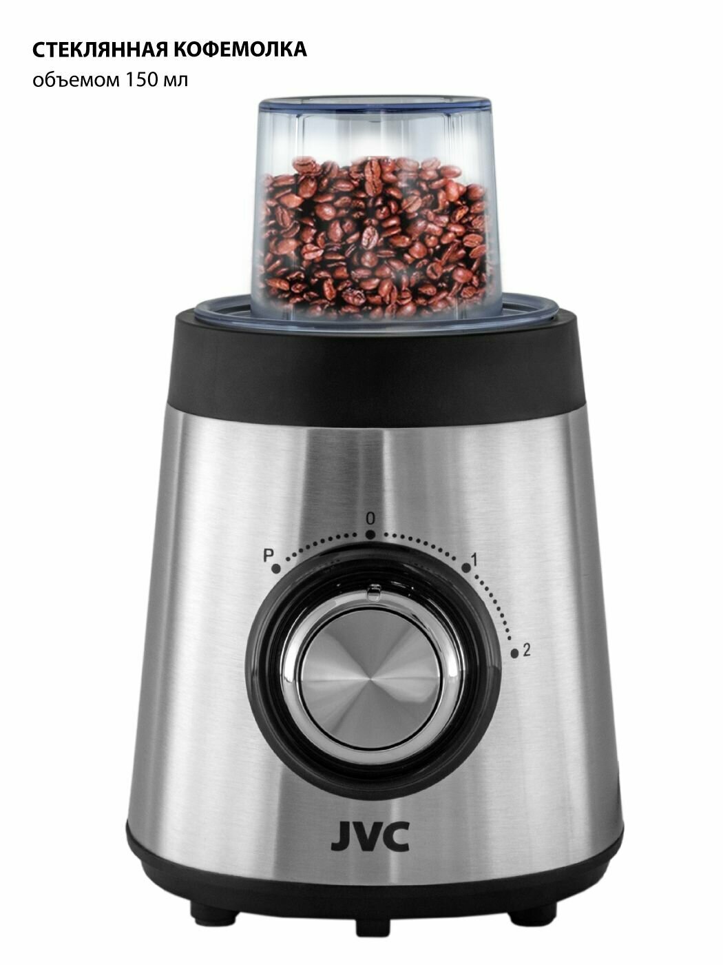 Стационарный блендер JVC 2 в 1 c кофемолкой 150 мл, импульсный режим, 2 скорости, стеклянный кувшин 1.5 литра, ножи из нержавеющей стали, 750 Вт, белый