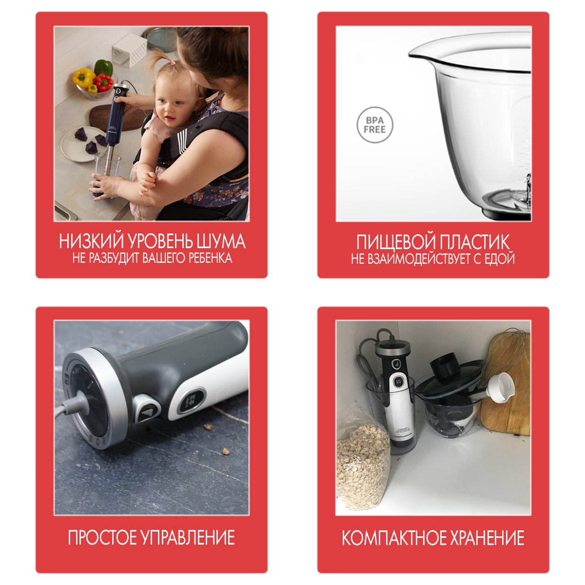 Блендер погружной измельчитель миксер с повышенным сроком службы 4 в 1 с 8-ступенчатой регулировкой скорости Morphy Richards, белый