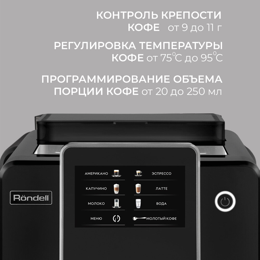 Кофемашина Rondell RDE-1110 black, 1500 Вт, давление помпы 19 бар, дисплей 5" сенсорный HD TFT, материал корпуса пластик