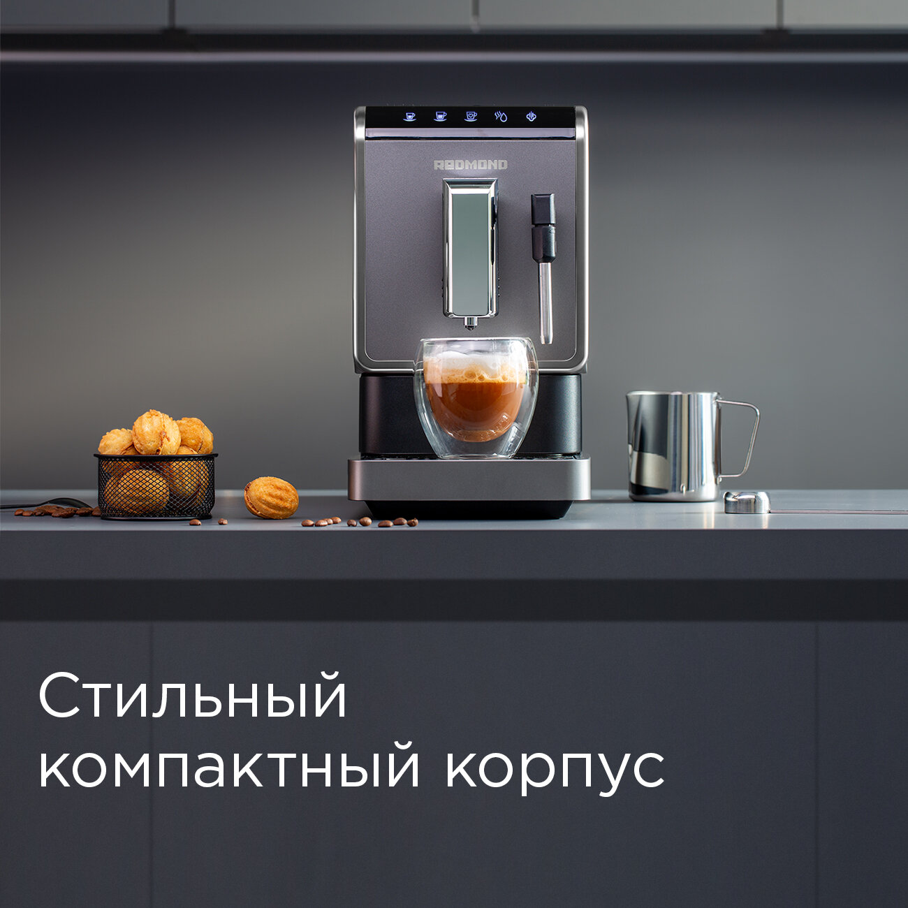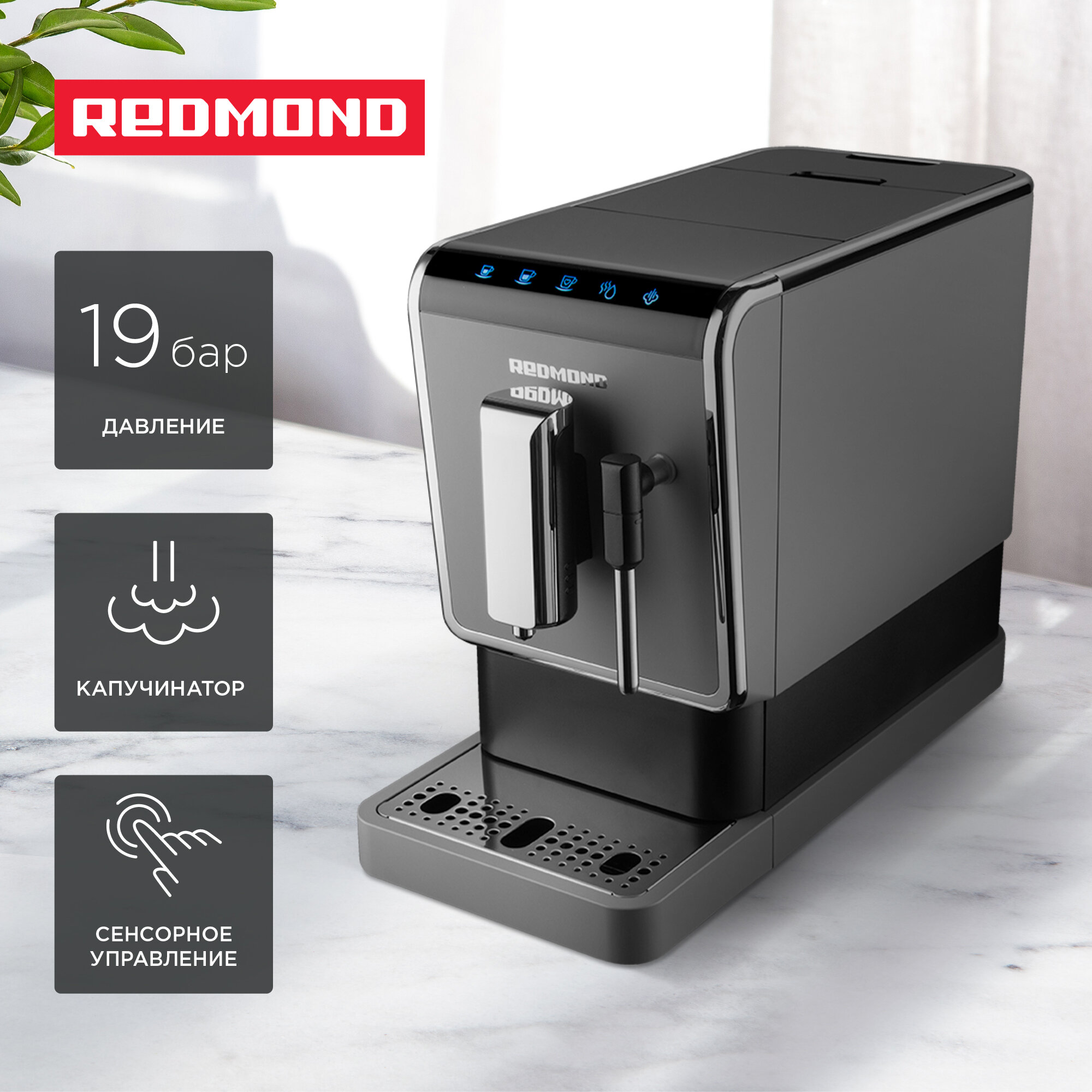 Кофемашина с автоматическим капучинатором REDMOND CM707, сенсорное управление, серый