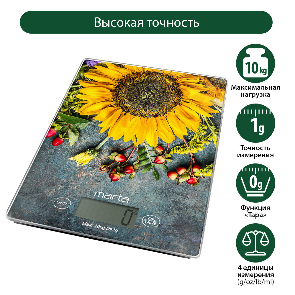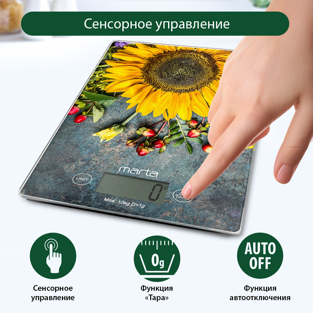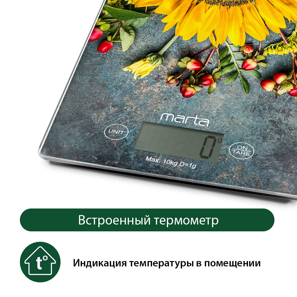 Весы кухонные MARTA MT-1634 летние цветы сенсор, встроенный термометр интересное: