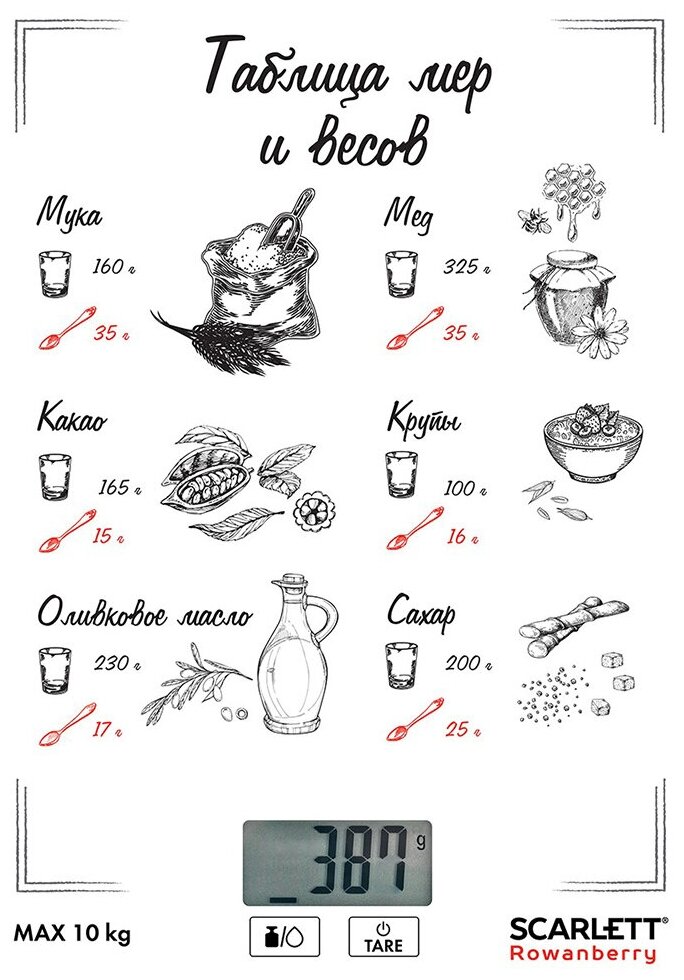 | Плюсы: | красивый, на чаше написан объём и вес разных продуктов |