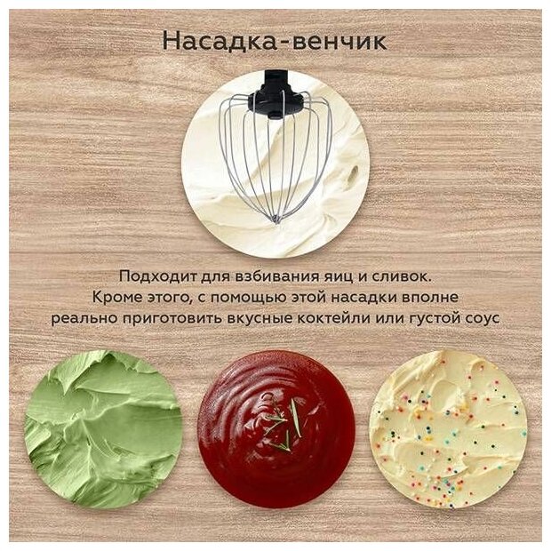 | Насадки | крючки для замешивания теста / венчик для взбивания |