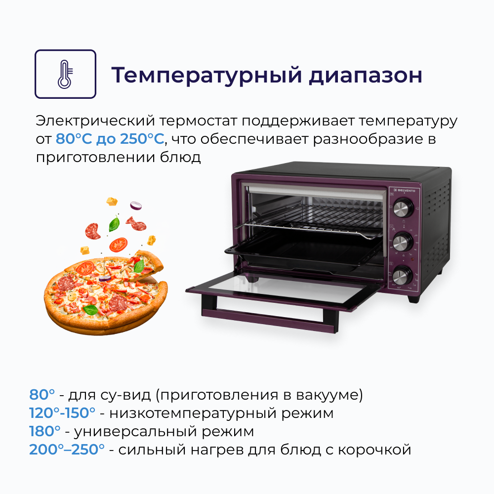 Мини печь электрическая DELVENTO D2507 Ergonomic+ / объем 25 литров / 3 режима нагрева / 3 года гарантии / функция тостер / таймер с автовыключением / 2 противня / хромированная решетка / полная комплектация