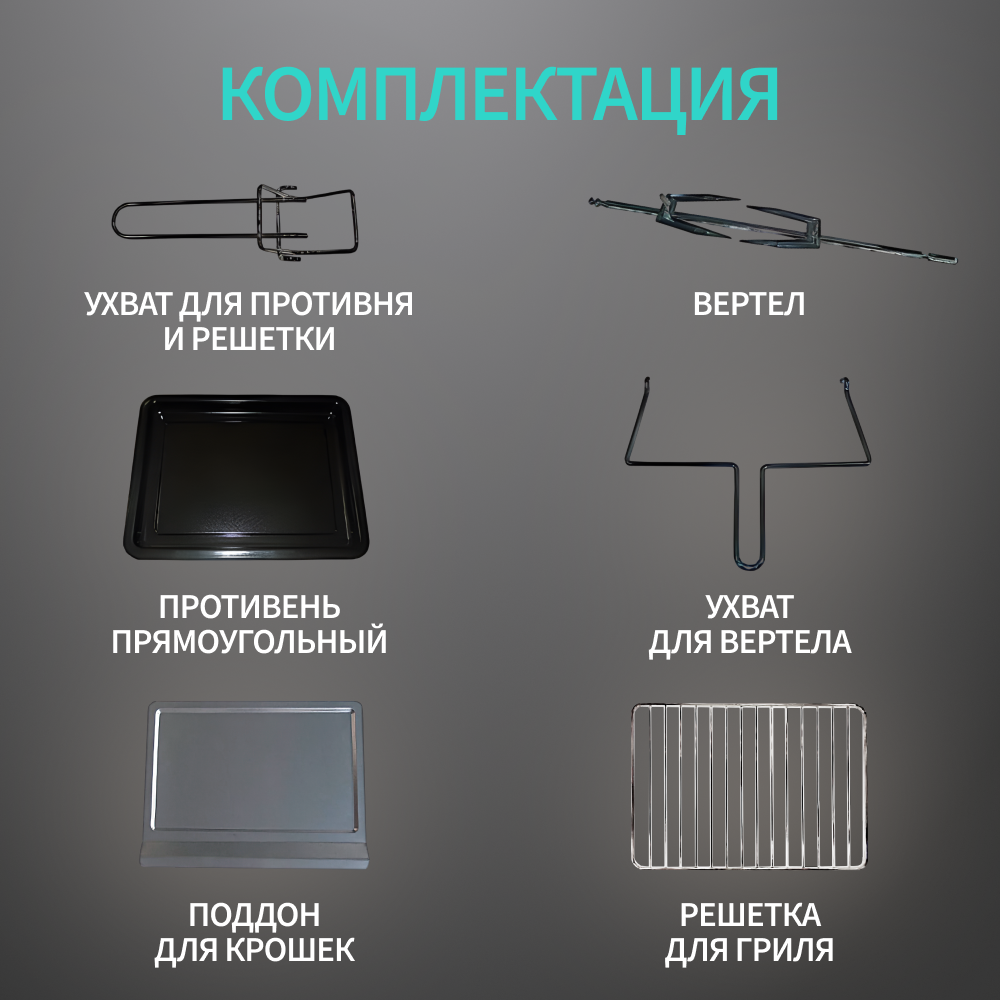 | Комплектация | держатель для противня/решётки / вертел / противень / решётка / ухват / поддон для сбора крошек |