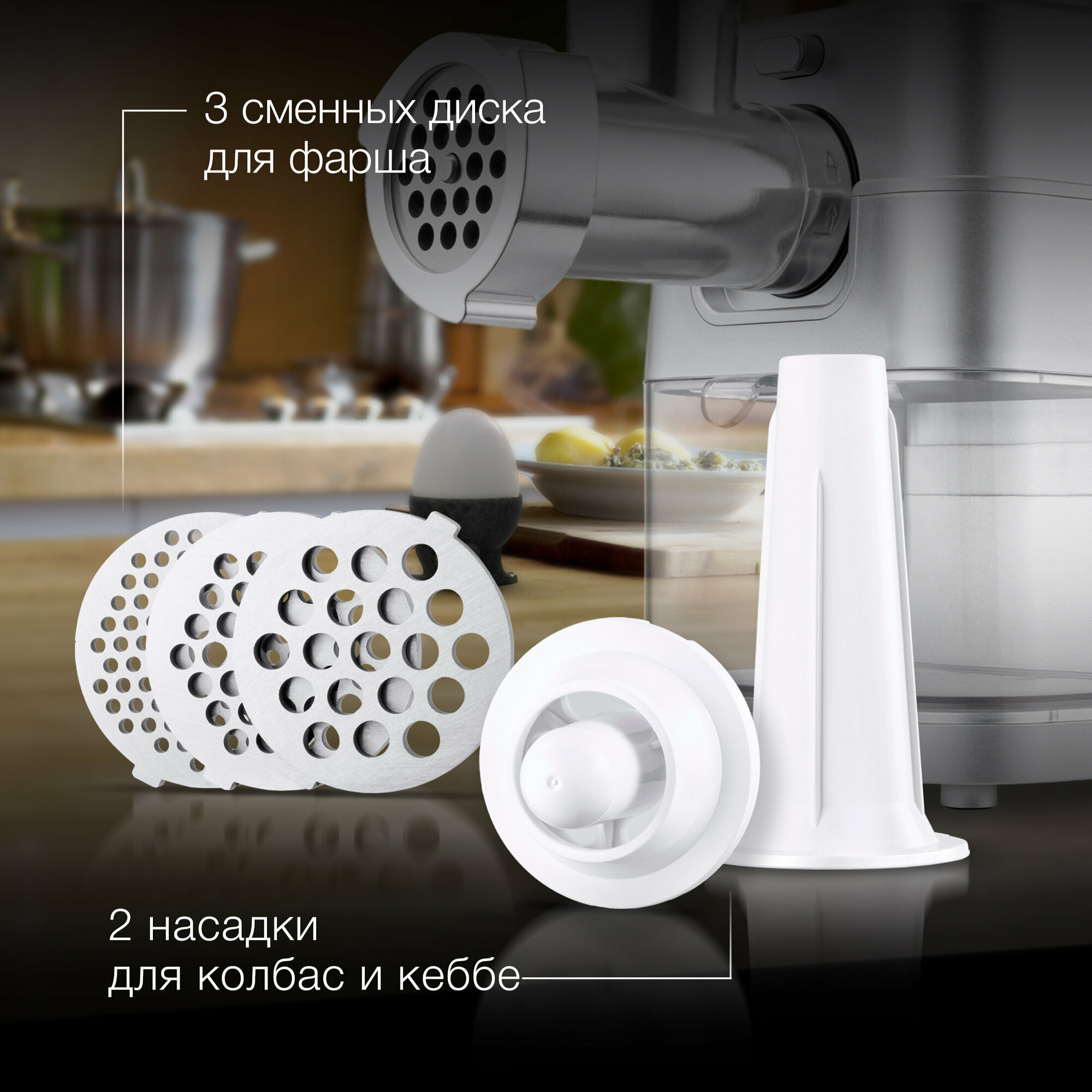 Мощная мясорубка, которая помогает измельчить мясо. В комплекте идет 2 диска разного размера и насадка для колбасок и кеббе. Пробовала делать и колбаски с помощью этого устройства. Получается вкуснее, чем в магазине. На мясорубке есть круговой переключатель, которым регулируется скорость. Ножки прорезинены, так мясорубка стоит устойчивее при работе.