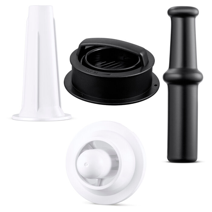 Дополнительные насадки для кебаба и колбасы придают ей больше функциональности. Она не скользит по столу и остается устойчивой во время работы. К тому же ее и разобрать легко, вал достается без проблем и остатки фарша омыть так же легко.
