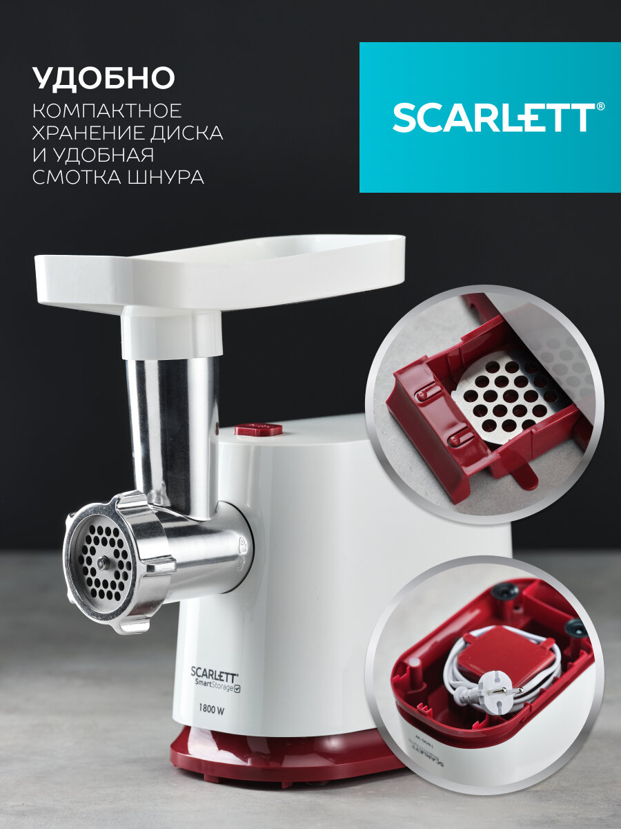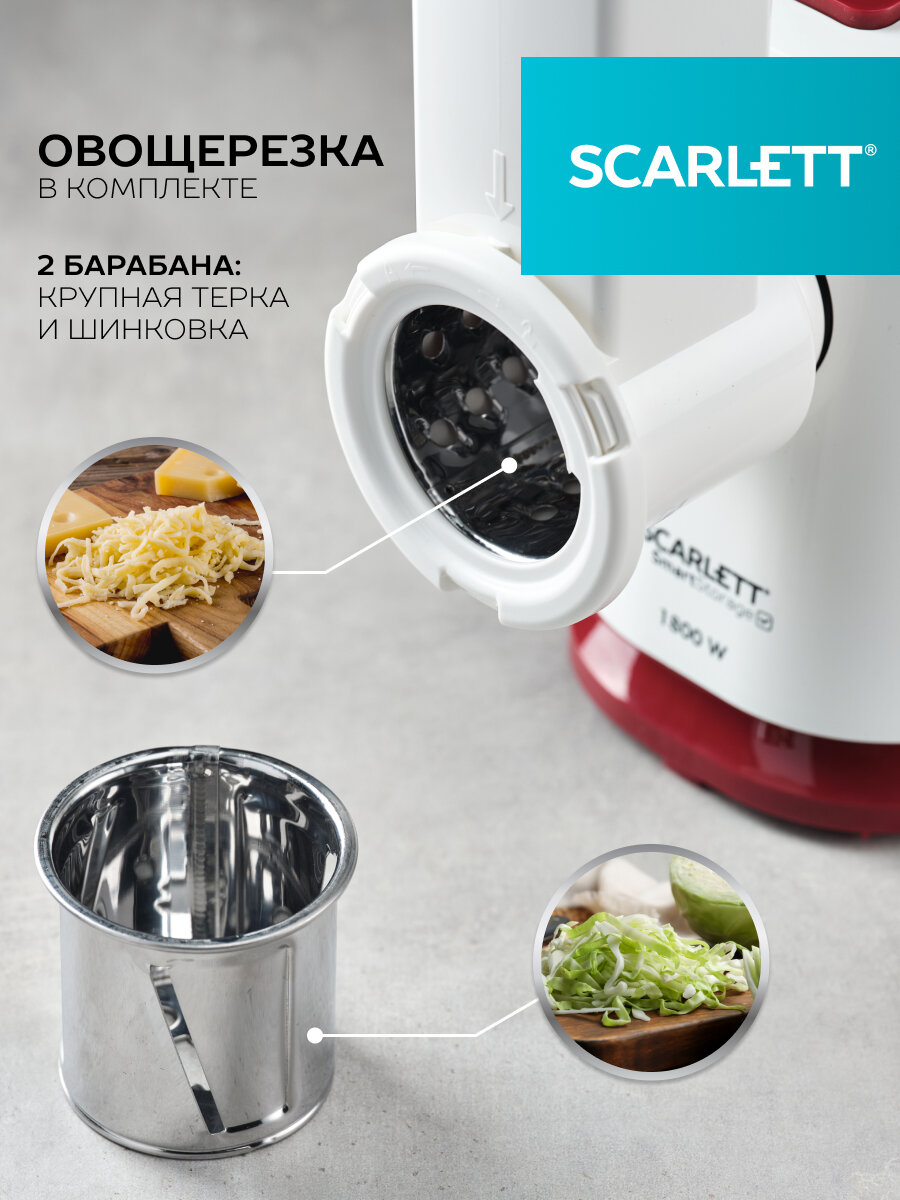 Электрическая мясорубка Scarlett с реверсом, овощерезкой с 2 барабанами для терки и шинковки, двумя решетками 5 и 7 мм, насадками для колбасок и кеббе и отсеком для хранения диска, 1800 Вт