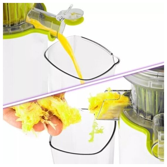 | Плюсы: | выжимает сок из фруктов отлично, жмых сухой |