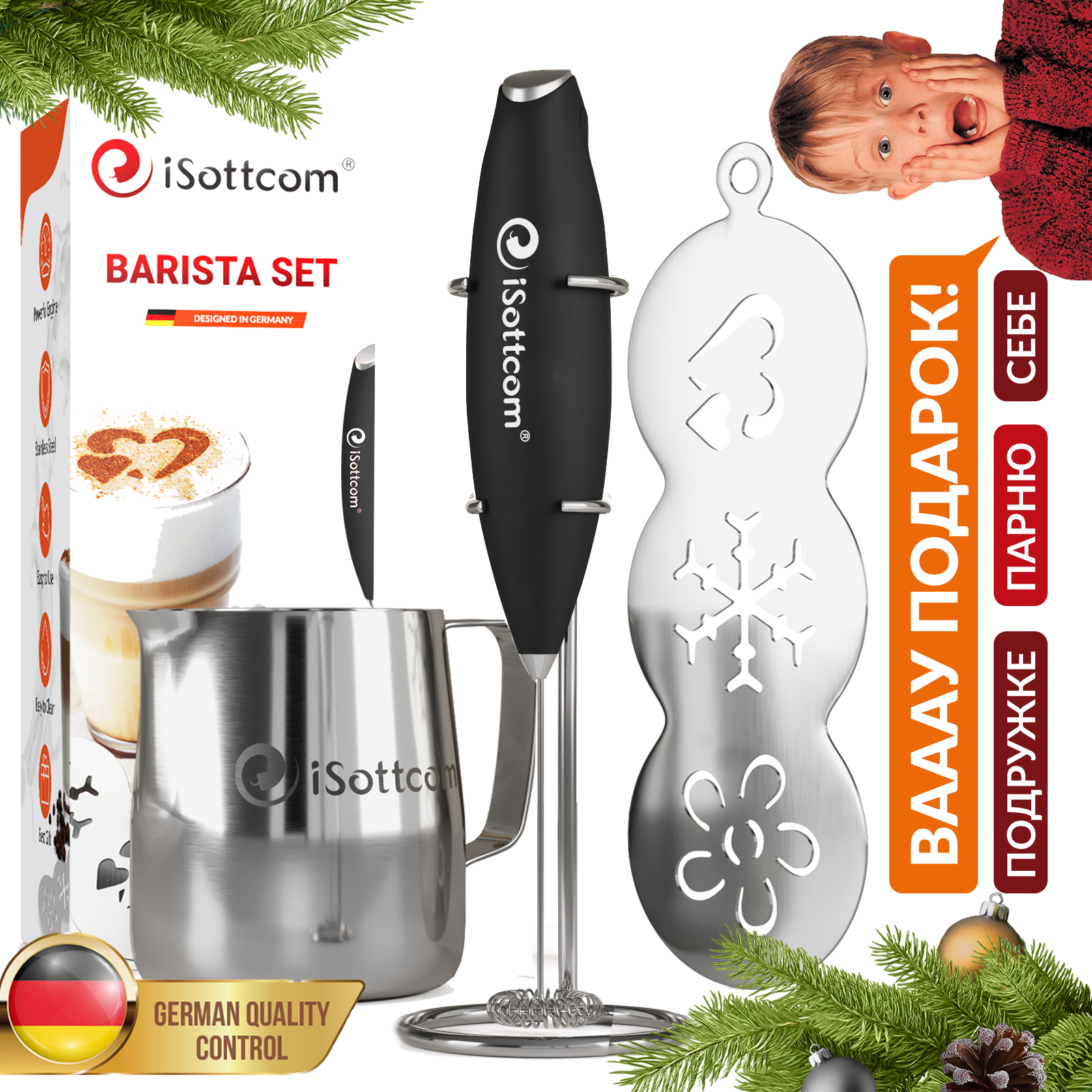Капучинатор, вспениватель для молока и сливок ручной, венчик для латте, подарочный набор 4 в 1 интересное:
