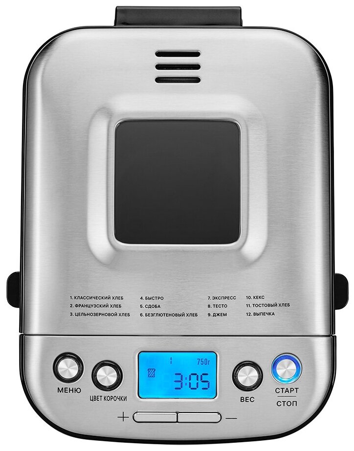 | Программы | варенье / кекс / Тесто / Безглютеновый хлеб / Быстро / Тостовый хлеб / Французский хлеб / Сдоба / Цельнозерновой хлеб / Экспресс / Классический хлеб / Выпечка |