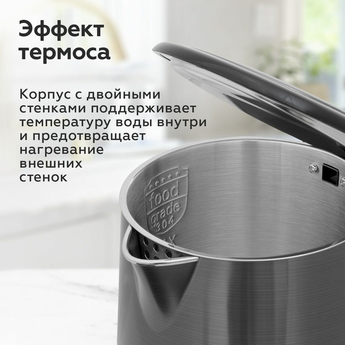 Двойные стенки, поэтому долго держит температуру воды, при этом стенки теплые, не обжечься цельная алюминиевая колба, вода нигде не контактирует с пластиком, выглядит надежно |
