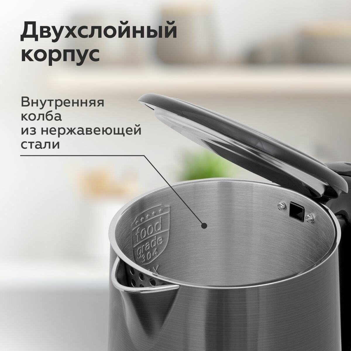 Цельнометаллическая колба = отсутствие вклеенных элементов (нагревательный элемент, окно) - гарантия того, что чайник не потечет. |