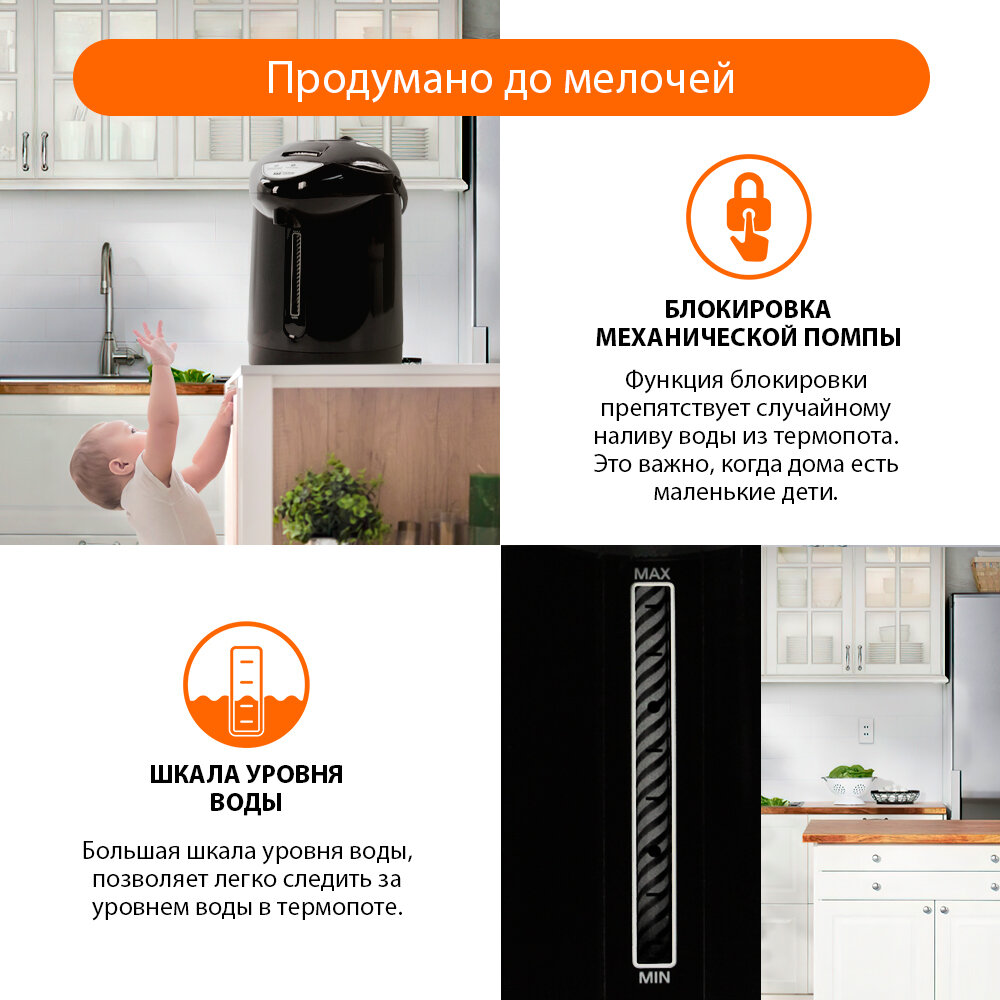 | Минусы: | После кипячения пластиковая защёлка не закрывается. Верхняя крышка с помпой оказывается негерметично прилегающей к основному корпусу. Это и опасно и некрасиво. Как только вода в термопоте остывает, верхняя крышка защелкивается. |