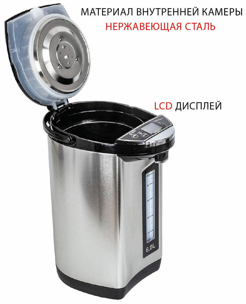 | Особенности | двойные стенки / вращение на 360 градусов / индикатор уровня воды / индикация включения / дисплей |