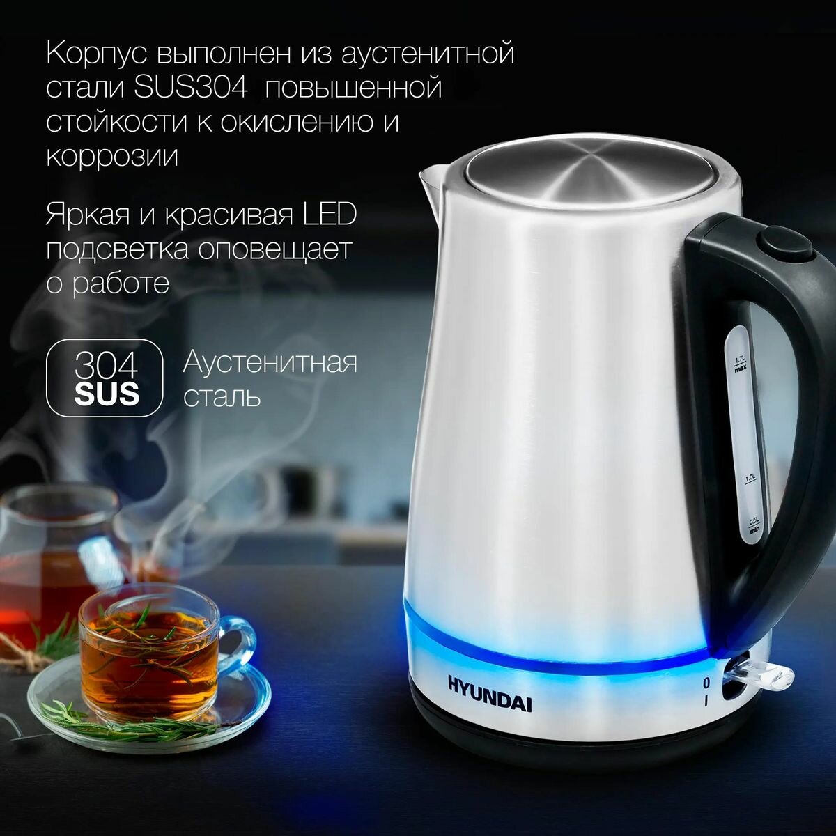 Электрочайник Hyundai HYK-S3020 , матовый, LED-подсветкой, 2200Вт, 1,7л, серебристый