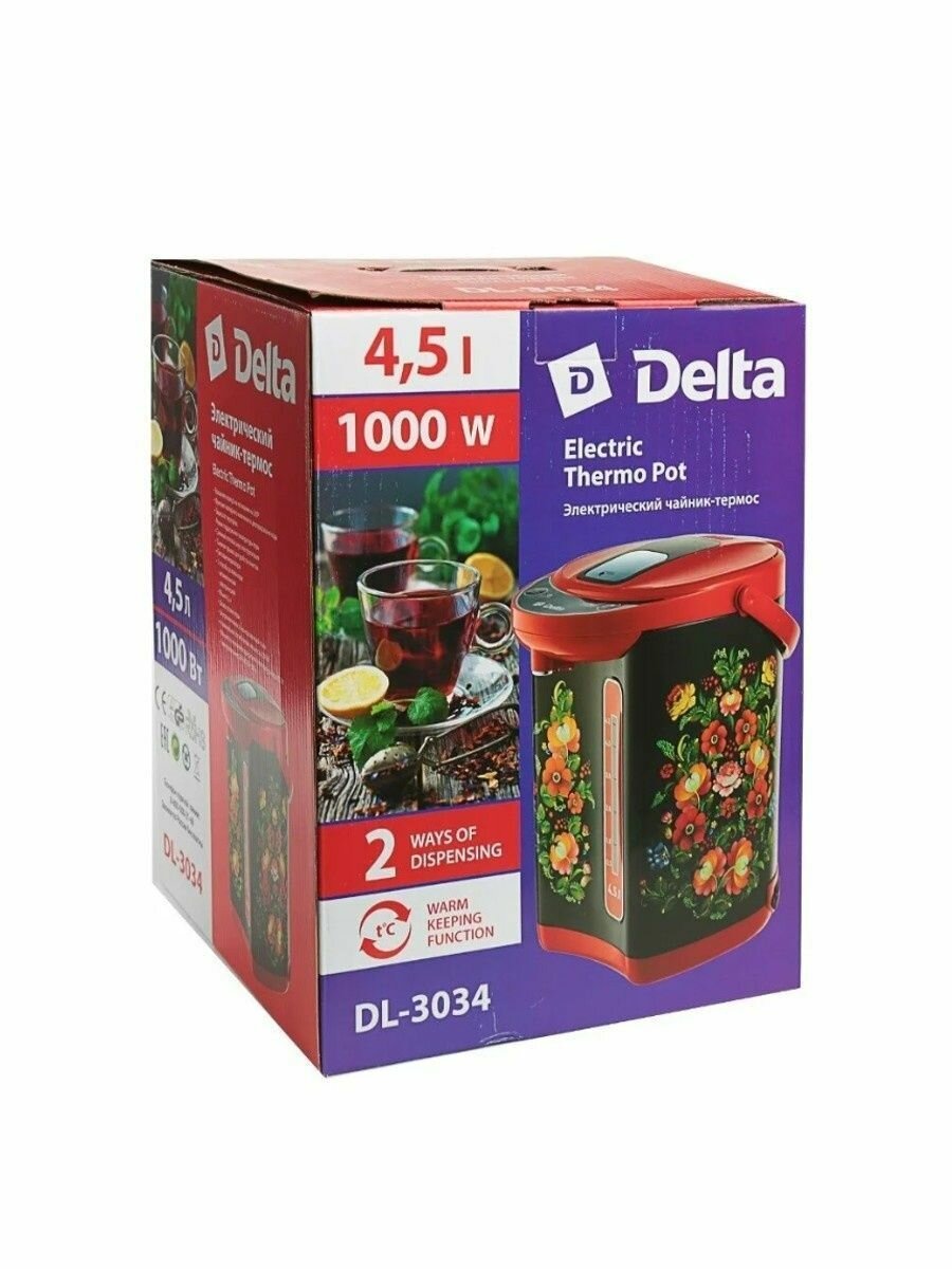Чайник-термос Электрический 4.5Л 1000ВТ Черн/кр Хохлома Delta DL-3034