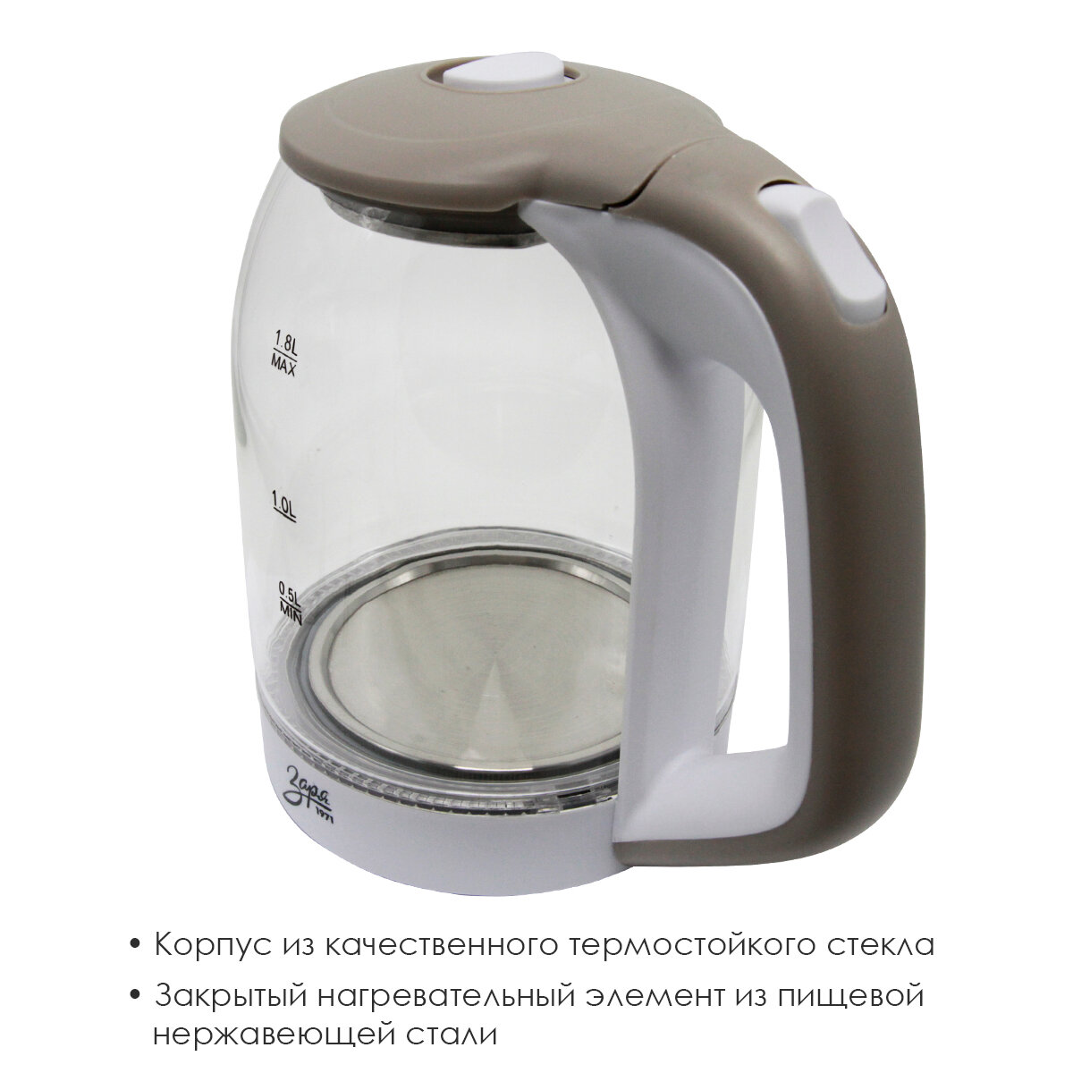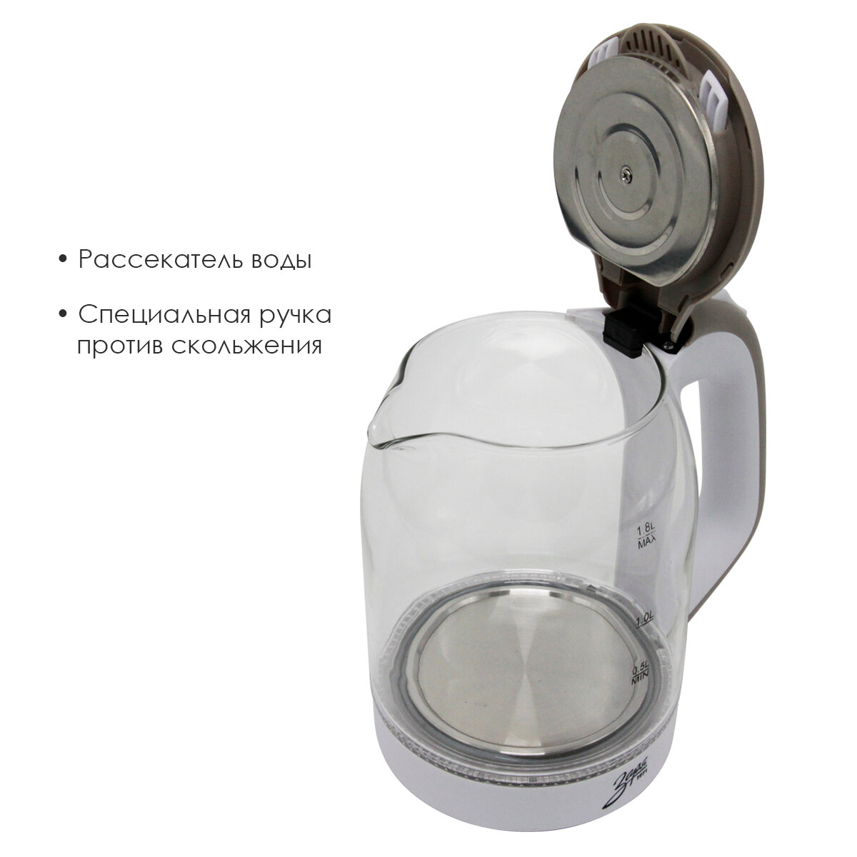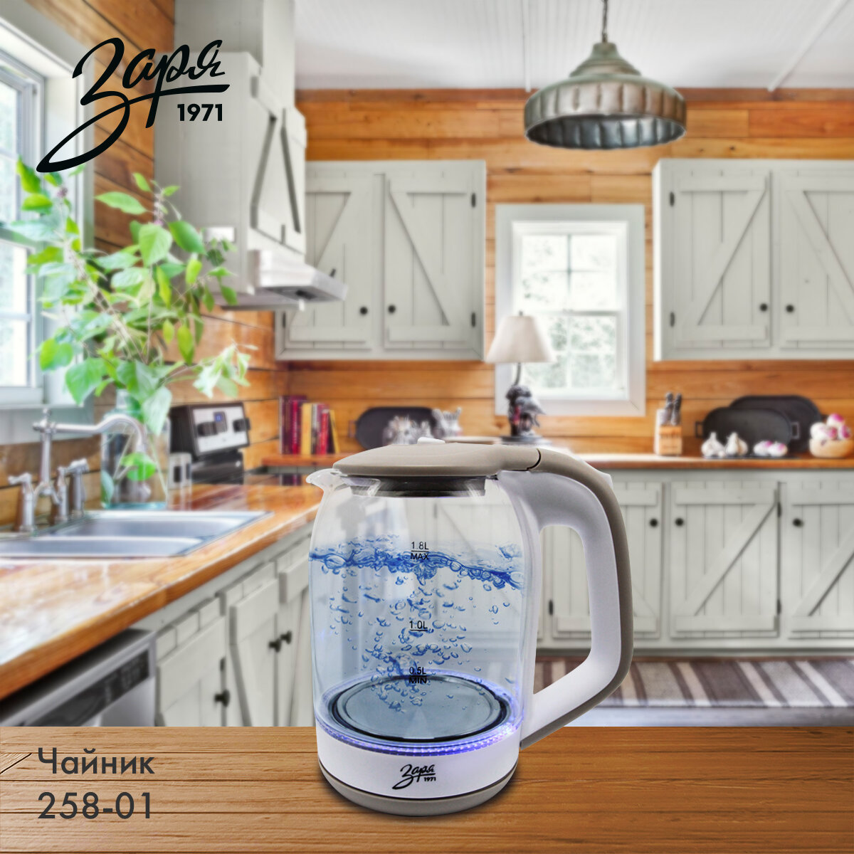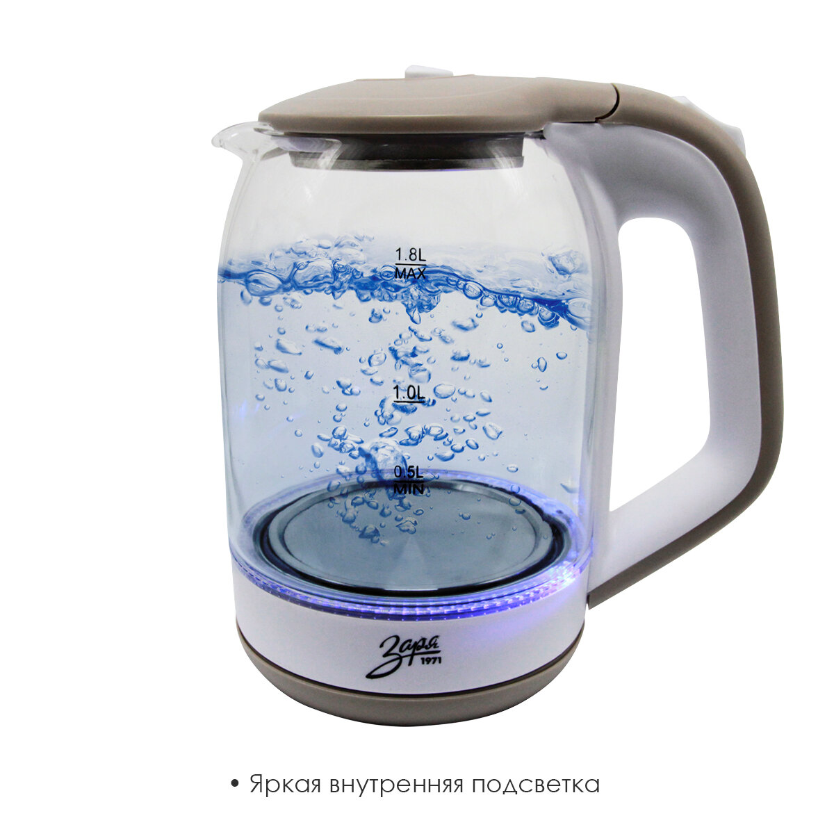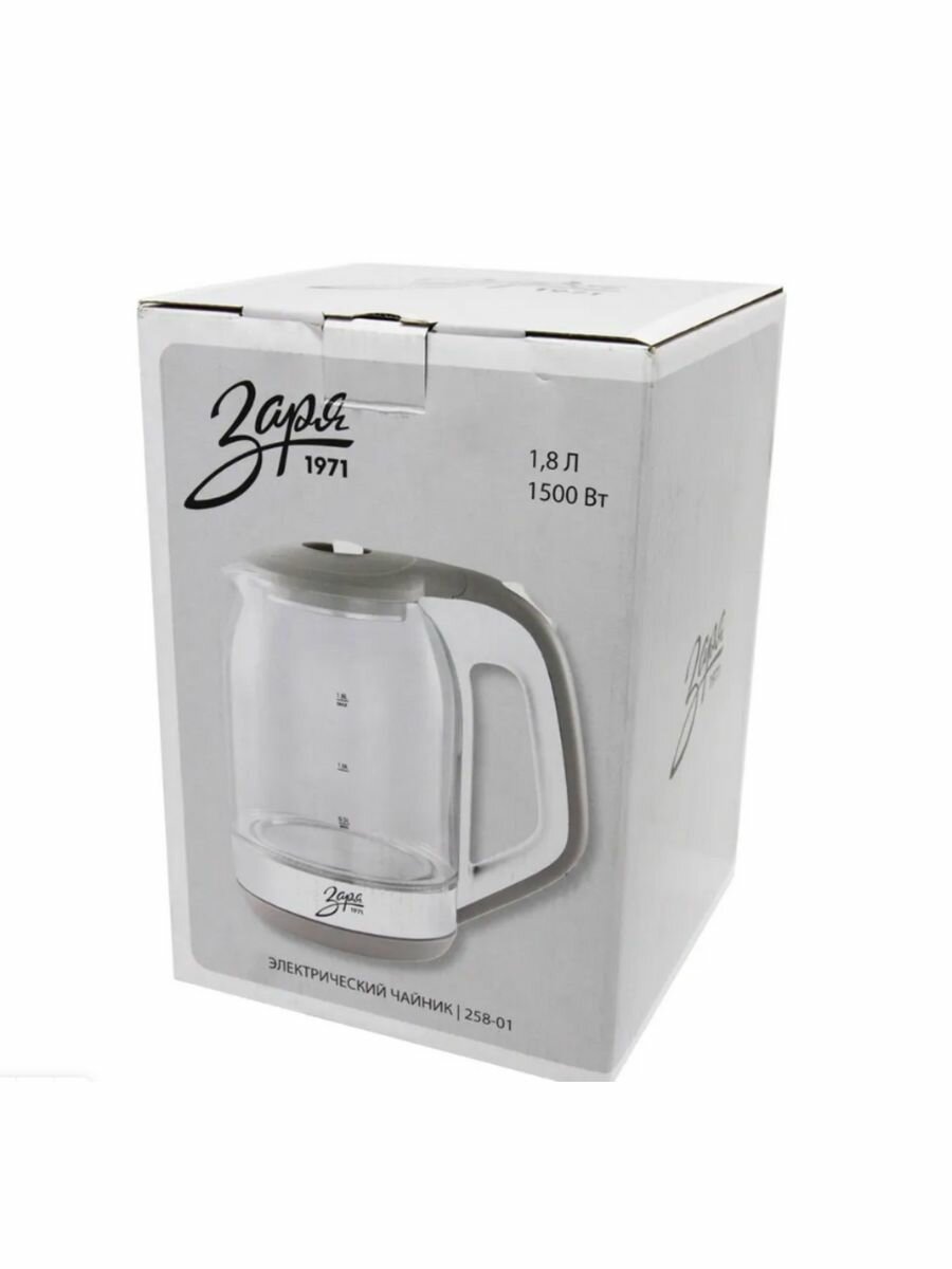Электрический чайник Заря 258-01 1.8 л / стеклянный / с подсветкой / дисковый ТЭН / автоотключение / поворот на 360 / электрочайник / 1500 Вт / белый